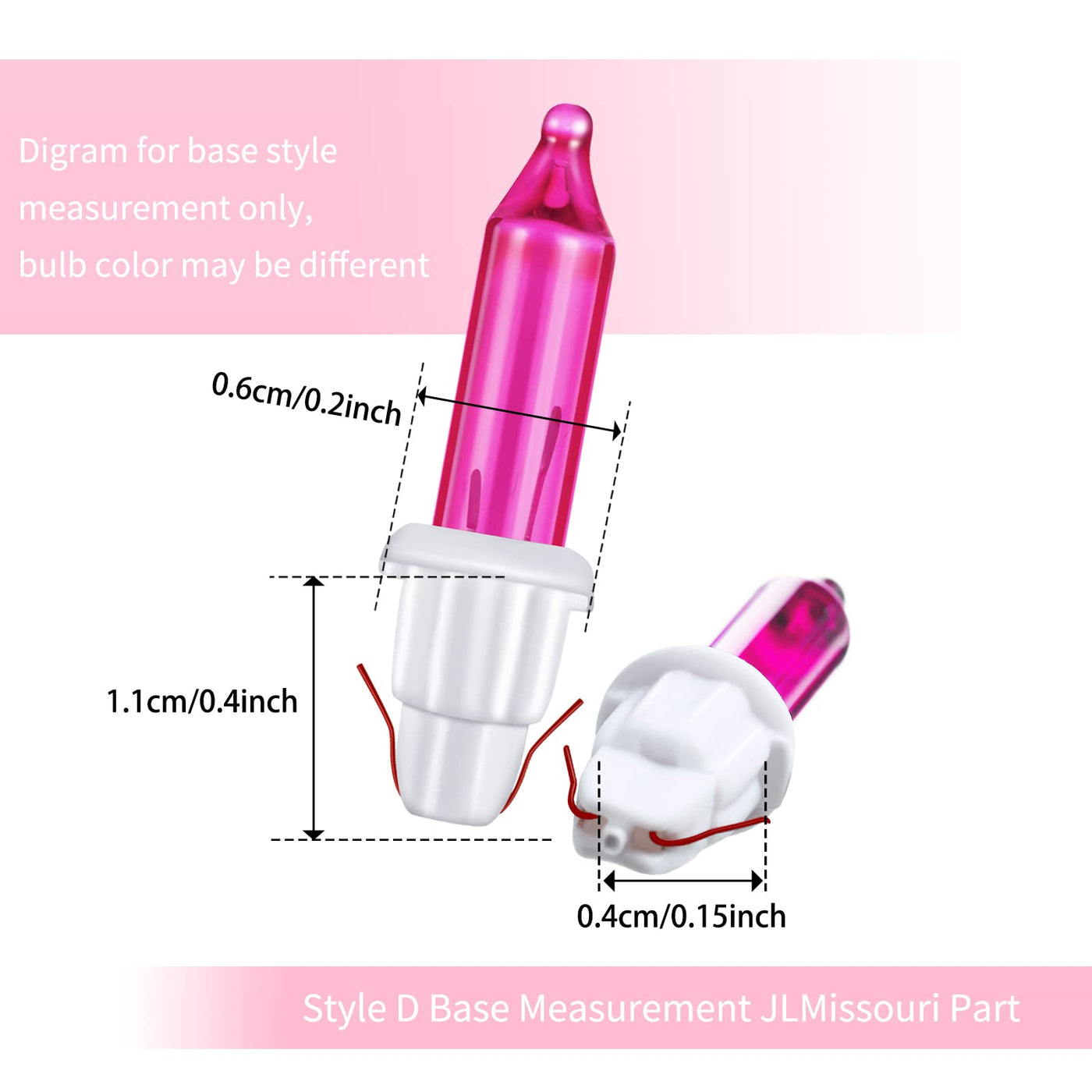 Q: What is the bulb and base size of these replacement bulbs?A: The base height of the bulbs is 1.1 cm (0.4 inch), the base diameter is 0.4 cm (0.15 inch), and the bulb diameter is 0.6 cm (0.2 inch), ensuring they fit standard string light setups.