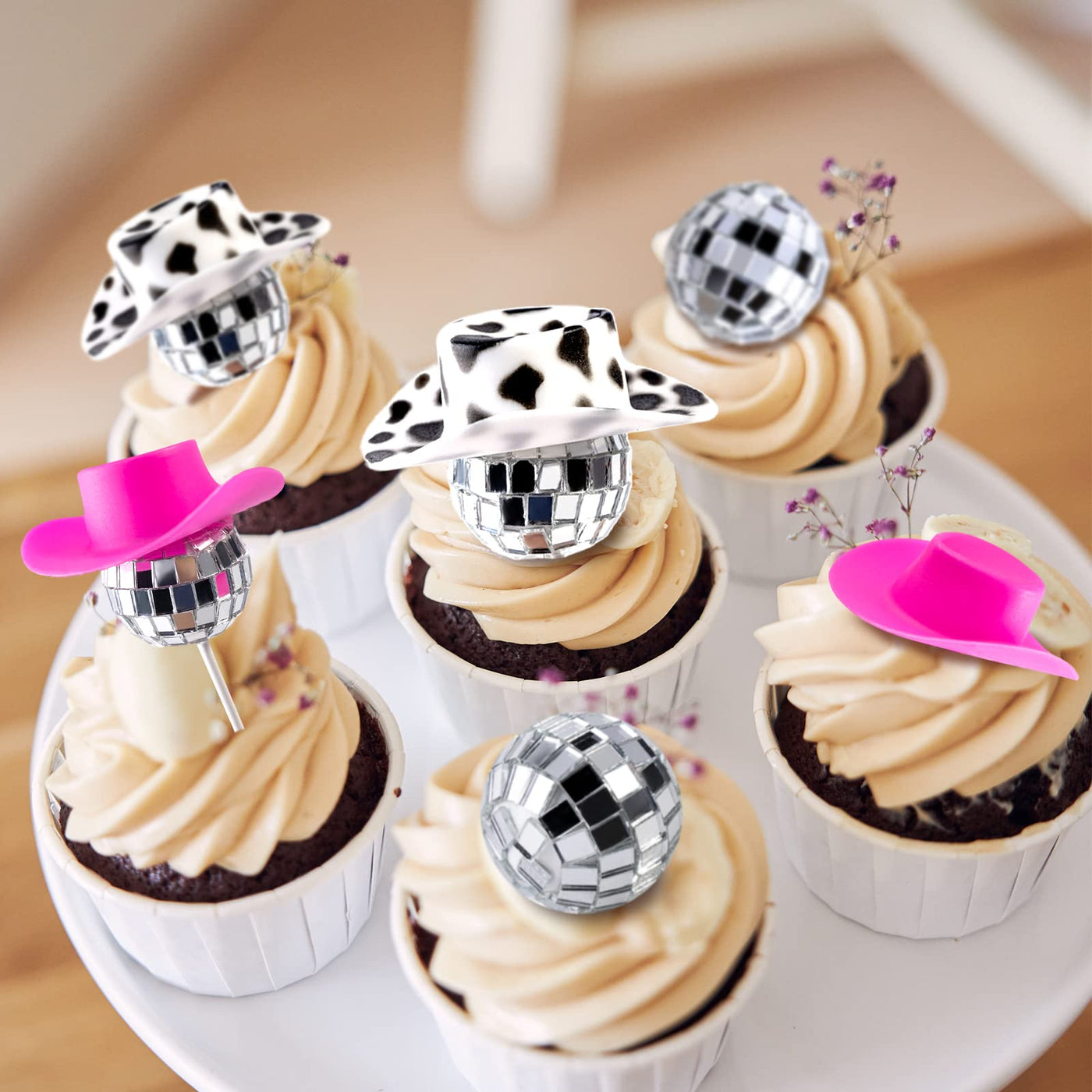 60Pcs Disco Cowgirl Pary Cake Decoration, 20Pcs Disco Ball Cup Toppers 10Pcs Mini Pink Cowgirl Hats 10Pcs Cow Print Cowboy Hats Westen Cowgirl Party Birthday Table Decor