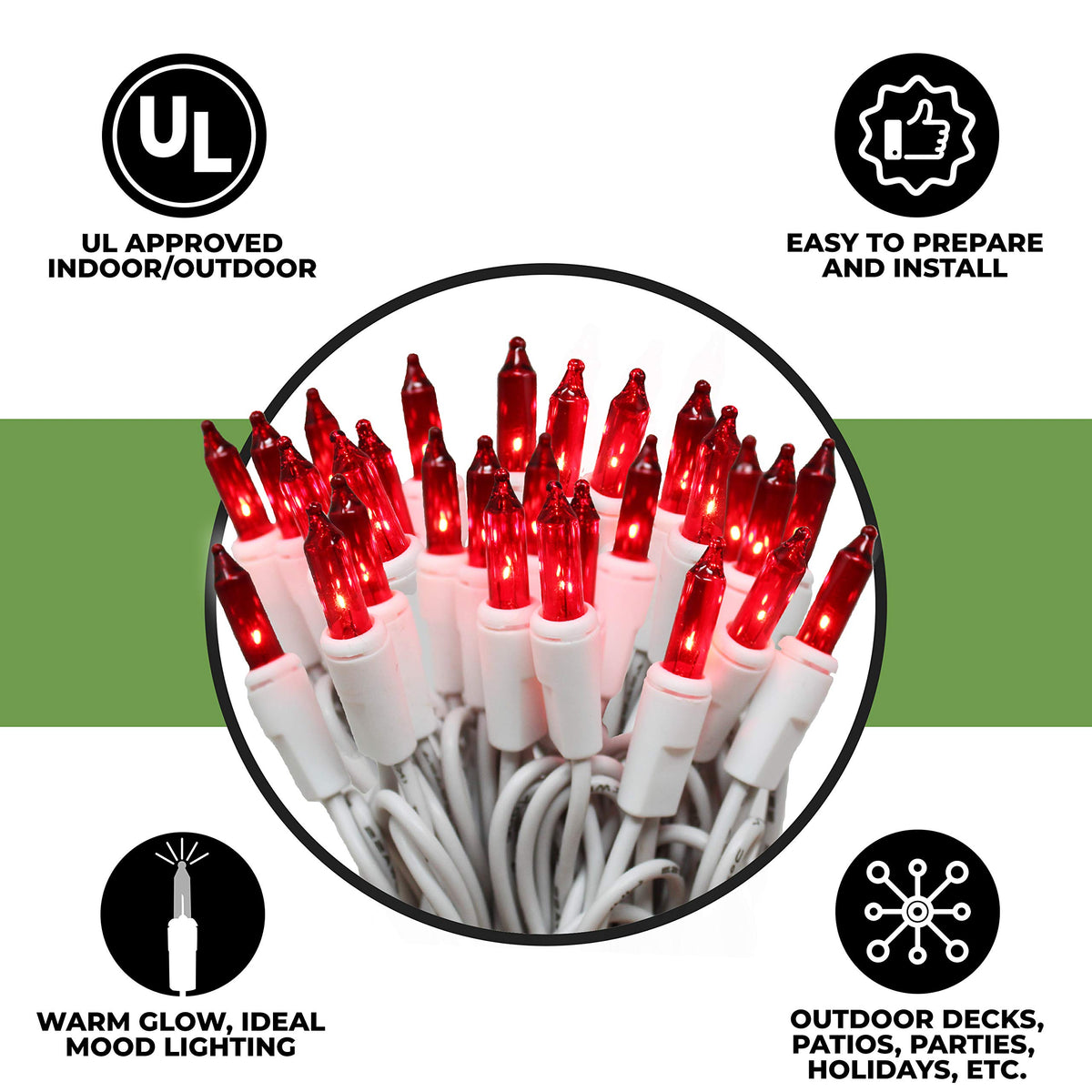 612 Vermont 50 Red Christmas Lights on a White Wire String, UL Approved, Indoor and Outdoor Use, 9 Foot of Lighted Length, 11 Fo