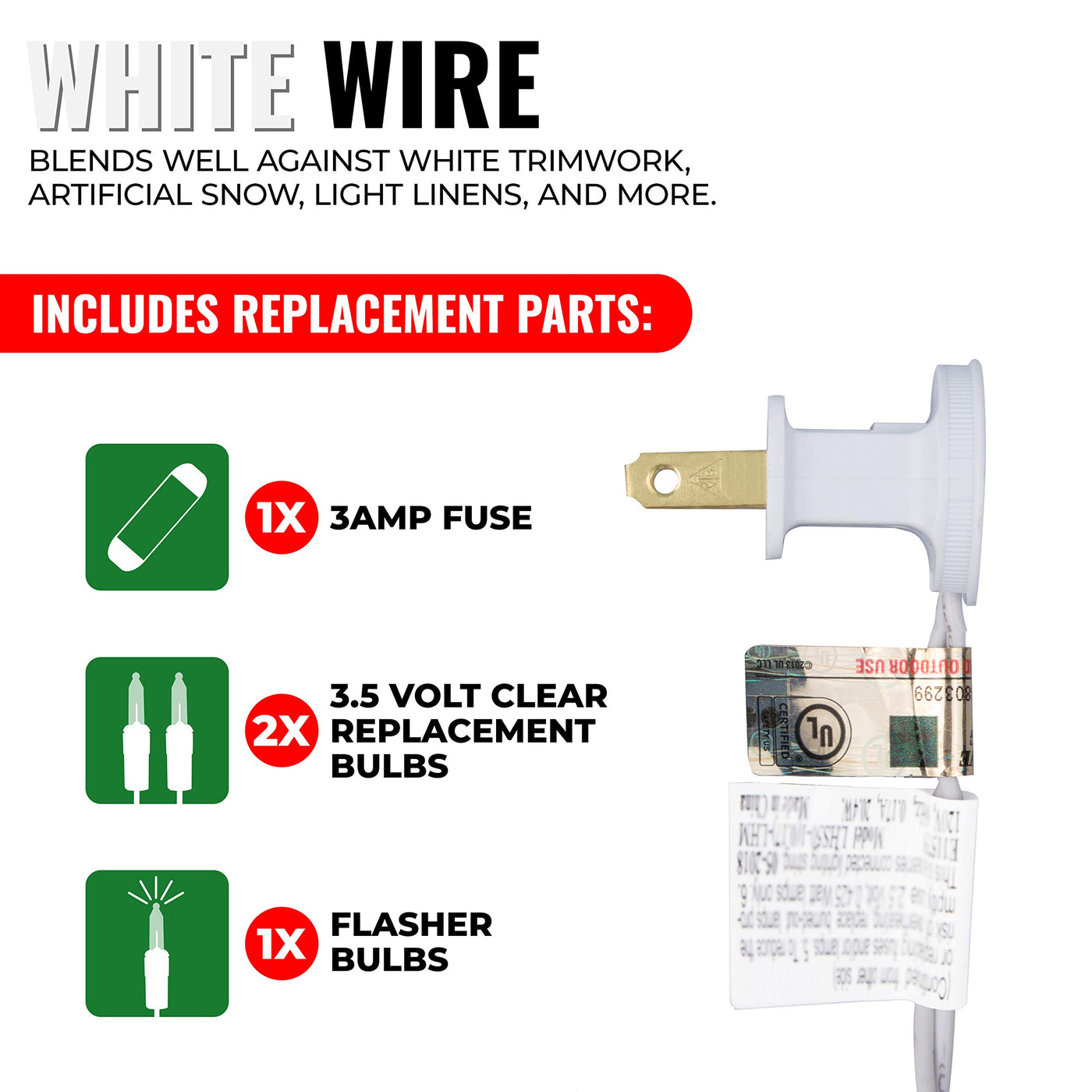 Our 612 Vermont short white wire Christmas lights are ideal for holiday decorating, crafts, weddings, events, parties, centerpieces, etc. Choose from 35 or 20 light count. The 35 light set features 6.1 foot of lighted length and 7.5 foot of total length. The 20 light set features 3.4 foot of lighted length and 4.9 foot of total length. 18'' lead cord with one plug end (male and female end on the 1 plug). UL approved for indoor use only. 35 light set is rated 15.6W. 20 light set is rated 9.6W. Do not exceed 216 watts connected end to end. Replace 35 light bulbs with 3.5 volt, 0.46 watt lamps. Replace 20 light bulbs with 6 volt, 0.48 watt lamps.