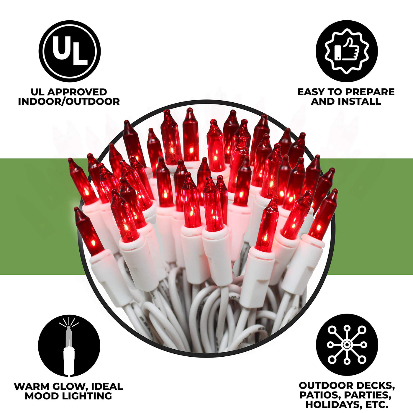 String of 100 Red Mini Lights suitable for indoor and outdoor use.