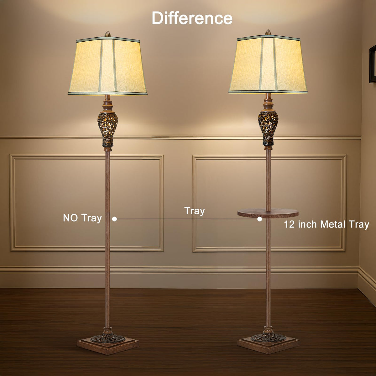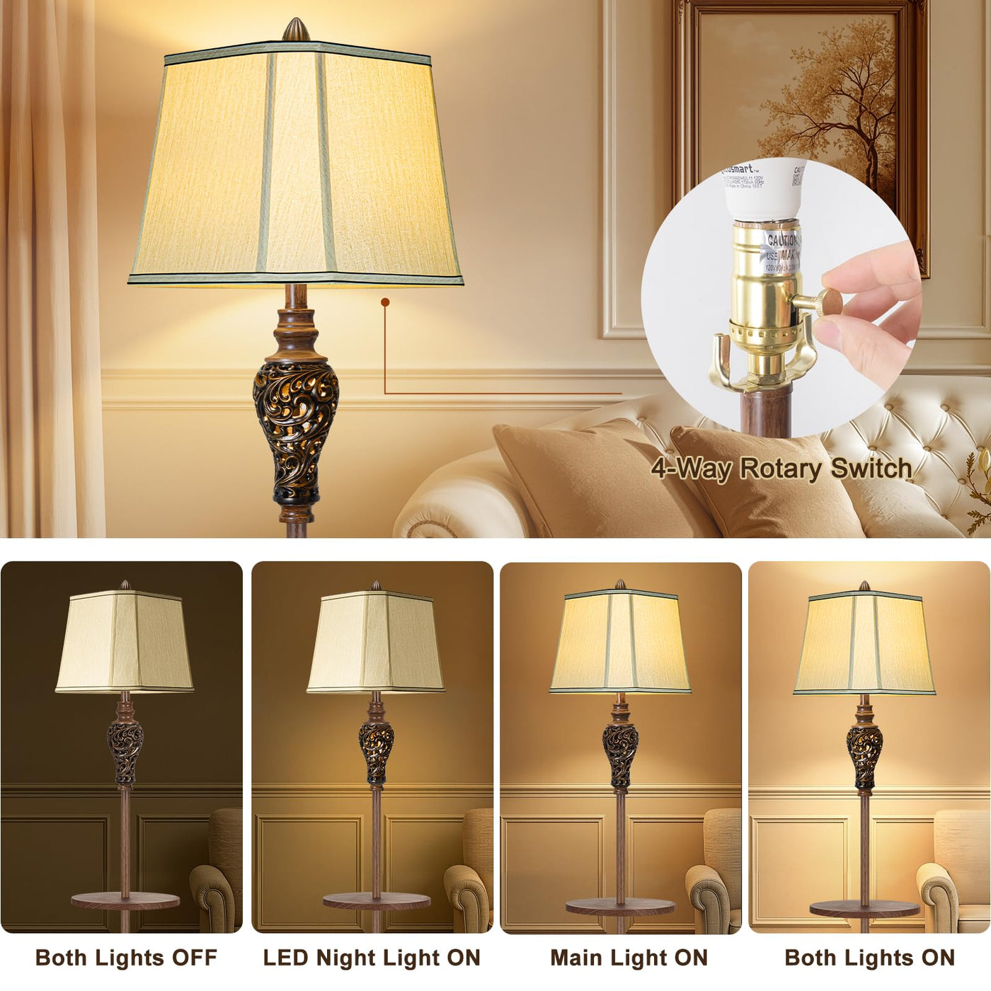 This Vintage Floor Lamp Stands 65'' Tall And Comes With A Soft Bell-Shaped Faux Silk Shade (12''Top X 15''Bottom X 10.5''High). 9'' Square Base. The Main Light Uses A Standard E26 Socket And Even Comes With A 9W Bulb, No Need To Buy It Separately. With A Luxurious Vintage Look, This Floor Lamp Is Specially Designed With A Beautifully Hollow Carved Leaves Base And Nightlight. The Bronze And Faux Woodgrain Finish On The Resin And Metal Lamp Body Adds Retro Classic Touch To Your Decor.