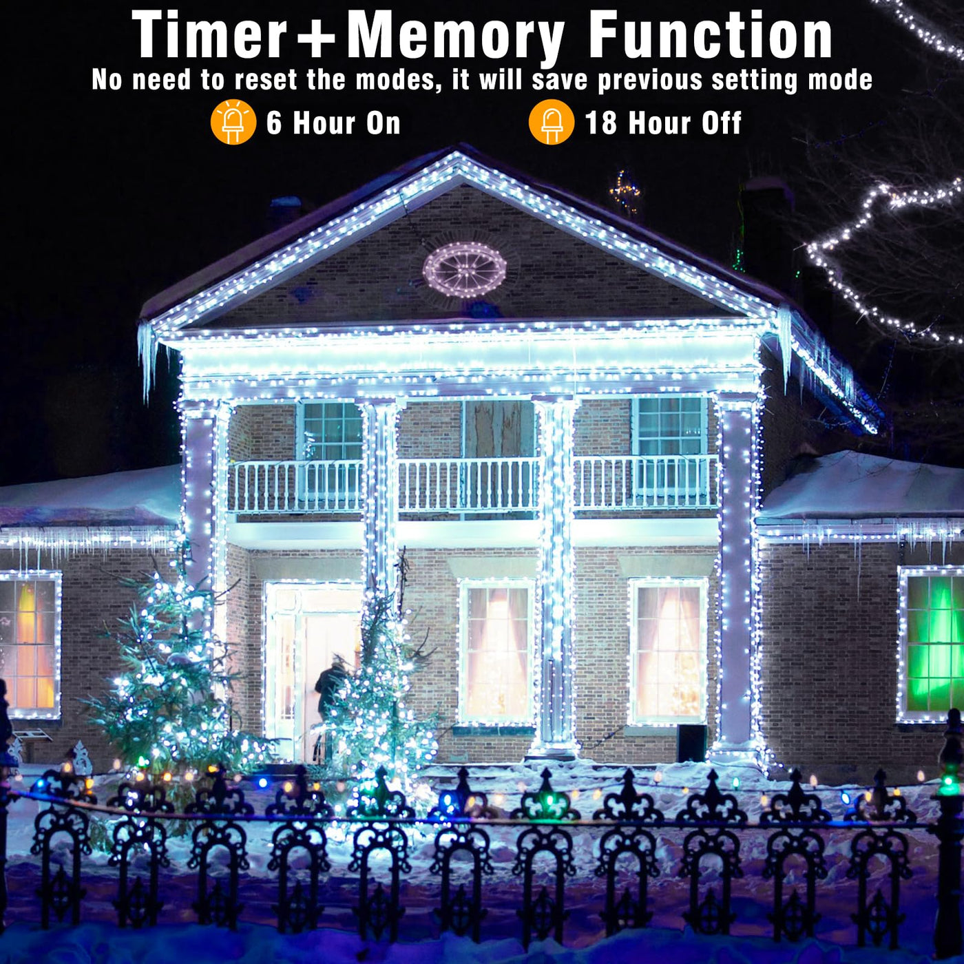 Q: How does the timer function work on these Christmas lights?A: The timer function can be activated by pressing and holding the button on the plug for 3 seconds until the green light turns on. Once activated, the lights will automatically turn on for 6 hours and off for 18 hours, making it convenient for regular use.