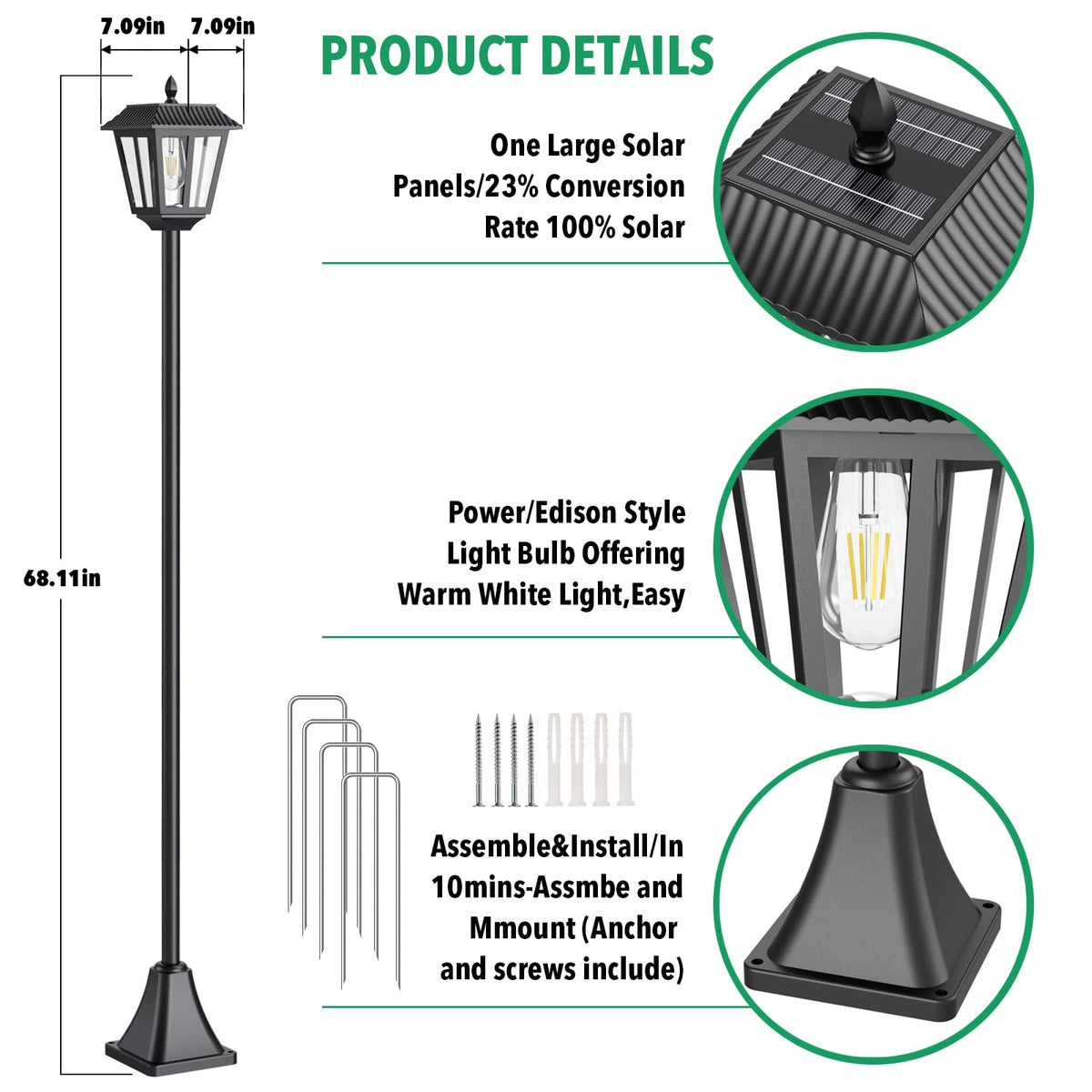 68'' Solar Lamp Post Light Outdoor - 3000K Warm White, Ip45 Waterproof Post Solar Lights Outdoor, Pole Lights Outdoor, Decorativ