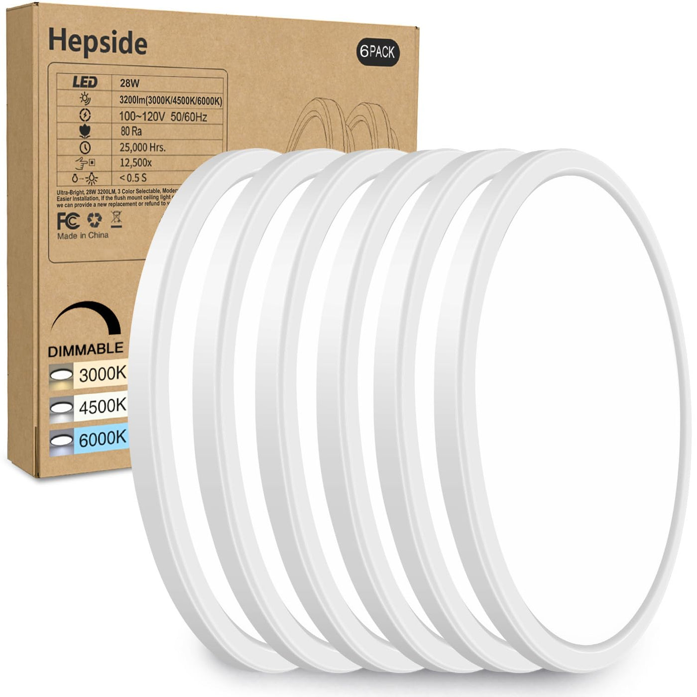'Equipped With 100 Powerful Leds, Using High Quality Of Fire-Resistance Plastic, Hepside Led Ceiling Light Can Provide A Super Bright Illuminance For A Wide Area.If You Want To Make Your Home Life More Stylish And Brighter, Hepside Low Profile Ceiling Light Can Provide You With The Answer... Hepside Stylish Led Ceiling Light With Ultra-Thin Design Is Multi-Functional And Energy Saving. Gentle Night Light Modes To Help Those Who Have Sleep Anxiety To Sleep More Peacefully At Night. A High-Quality Fire-Resistant Plastic Enclosure Protects Against Any Potential Disaster. Adjustable Brightness Modes To Provide More Flexibility. 3 Optional Color Temperatures To Meet Your Daily Needs. High-Performance Design Saves Up To 90% Of Your Home Electricity Bill. High Cri >85, Provide Vivid And Natural Lighting In Your Room. Easy To Install + Super Bright + Eye Protection Lifetime Technical Support, We Are Your Strong Backing All The Time. Specifications: Voltage: Ac100-120V Power: 28W (Equal 250W Incandescent) Lumen: 3200Lm Cri: >85 Light Beam Angle: 120? Lifespan: 25000 Hours Material: Pc Product Diameter/Thickness:12*0.94Inch Waterproof & Dustproof: Yes Packing Lists: 6 X 28W Led Ceiling Light 6 Xconnector 18 X Screws 1 X User Manual Color And Brighness Adjustable The Color Modes Between: 3000K-4500K-6000K The Brightness Range You Can Adjust From 10%-100%, Give You More Convenience And Choice. Warm Tips For Led Ceiling Lights : Please Confirm The Relevant Parameter Before Purchase To Ensure The Lamp Is Suitable For You. Make Sure To Cut Off The Power Source Before Installation. Clean With A Slightly Wet And Soft Cloth. Please Do Not Use Any Cleaning Or Abrasive Solutions. Energy Saving And Time-Saving Replace Double 250W Incandescent Lights By 28W Led Flush Mount Ceiling Light, And The Long Lifespan Will Save Your Effort And Maintenance Cost, No Need Of Bulbs. No Flicker And Eye Protection Adopted High Quality Led Inside, It Emits Uniform Bright And Stable White Light Without Flickering, No Blue Light, Avoid Eye Fatigue And Protects Your Eyes From Glare Light. Ip54 Waterproof & Dust-Proof Sealed Design To Protect Against Water Splash At Any Angle, No Worry About Using In Wet Rooms. Dustproof Rating Prevents Dust From Entering The Light And Ensure No Black Spot On Light After Long-Time Using.''