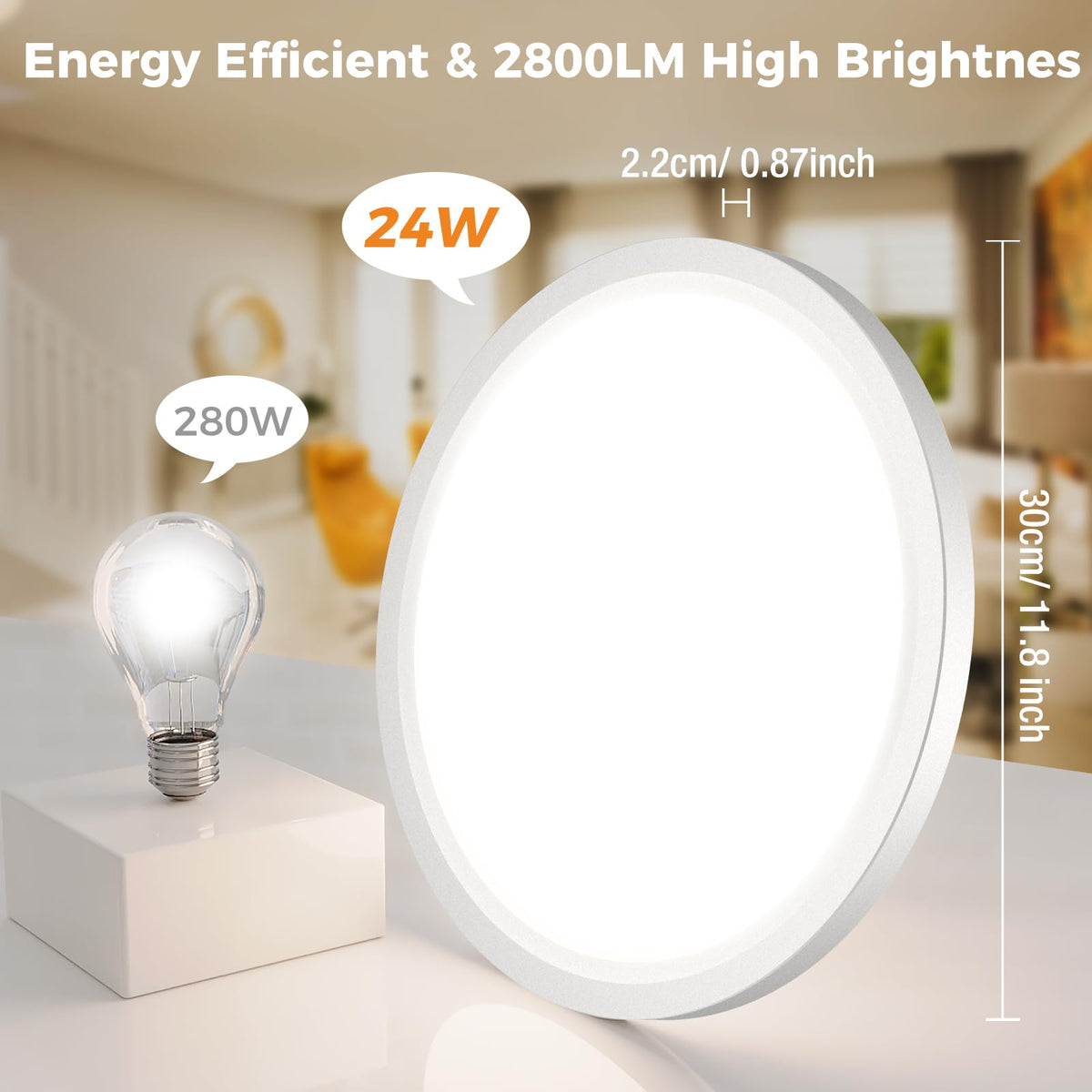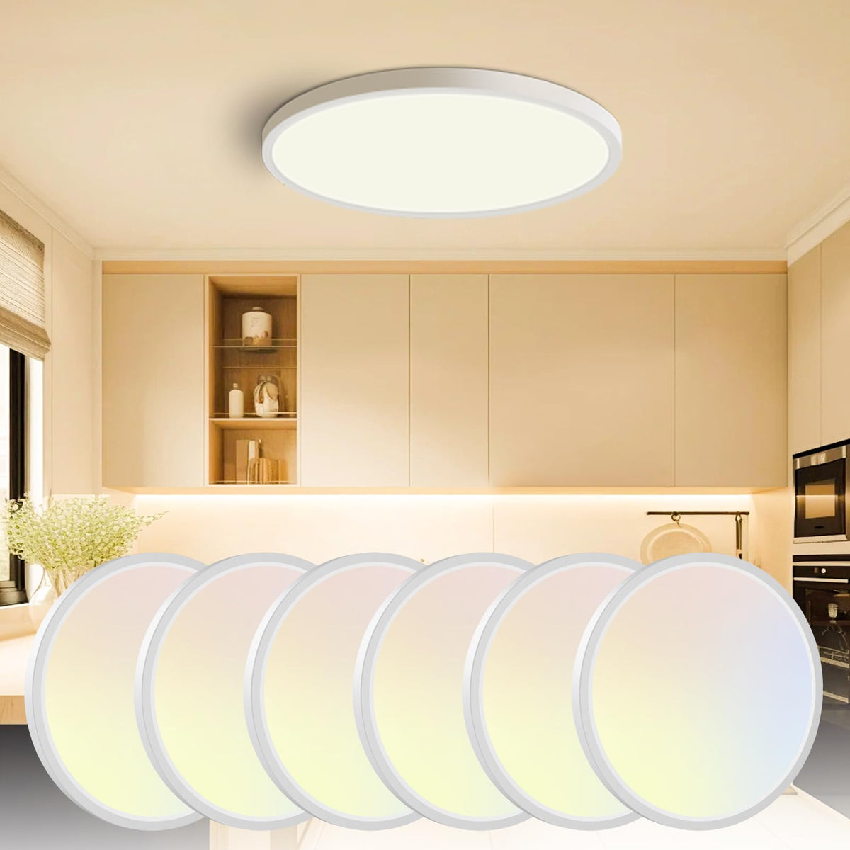 Equipped with 100 powerful leds, Using high quality of fire-resistance plastic, Slochi led ceiling light can provide a super bright illuminance for a wide area.If you want to make your home life more stylish and brighter, Slochi low profile ceiling light can provide you with the answer... Slochi stylish LED Ceiling Light with Ultra-thin design is multi-functional and energy saving. Gentle Night Light Modes to help those who have sleep anxiety to sleep more peacefully at night. A high-quality fire-resistant plastic enclosure protects against any potential disaster. 3 Optional Color Temperatures to meet your daily needs. High-performance design saves up to 90% of your home electricity bill. High CRI >80, provide vivid and natural lighting in your room. Easy to Install + Super Bright + Eye Protection Specifications: Voltage: AC100-120V Power: 24W (equal 280W Incandescent) Lumen:2800LM CRI: >80 Light beam Angle: 120? Lifespan: 25000 Hours Material: PC Product Diameter/Thickness:12*0.94inch Waterproof & Dustproof: Yes Packing Lists: 12 x24W LED Ceiling Light 12 xConnector 36 x screws 1 x User Manual Color Adjustable The color modes between: 3000K-4000K-6500K Warm Tips for LED Ceiling Lights : Please confirm the relevant parameter before purchase to ensure the lamp is suitable for you. Make sure to cut off the power source before installation. Clean with a slightly wet and soft cloth. Please do not use any cleaning or abrasive solutions.