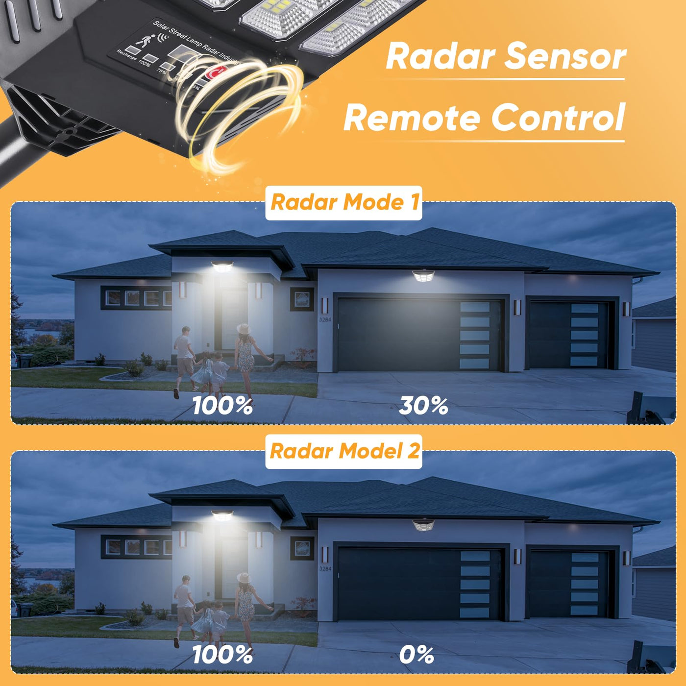 ?BRIGHT SOLAR LIGHTS OUTDOOR?The solar lights outdoor are equipped with 144 high-brightness 5730 LED beads, delivering a brightness of 20,000 LM-perfect for solar flood lights outdoor. With just 6-8 hours of sunlight charging, they ensure reliable dusk-to-dawn lighting for your garden, driveway, street, or patio. | ?5 MODES & REMOTE CONTROL?Mode 1: Low brightness until motion is detected; Mode 2: Off until motion is detected; Mode 3: After 3/4/5 hours of lighting, switches to motion sensor; Mode 4: Always on lighting(25%-100% brightness dimmable) until the next day. Package included 6 controllers, all lights can be controlled with one remote. | ?0 ELECTRICITY BILLS SOLAR POWERED?The solar street light uses updated 392*200mm large monocrystalline silicon solar panel, solar powering during the day, no electricity bills, with a large-capacity 4000mah battery, it provides reliable and lasting lights for residential and commercial applications. | ?DURABLE & WATERPROOF?Built with waterproof technology ABS, these solar garden lights can withstand rain, snow, and extreme temperatures (-5