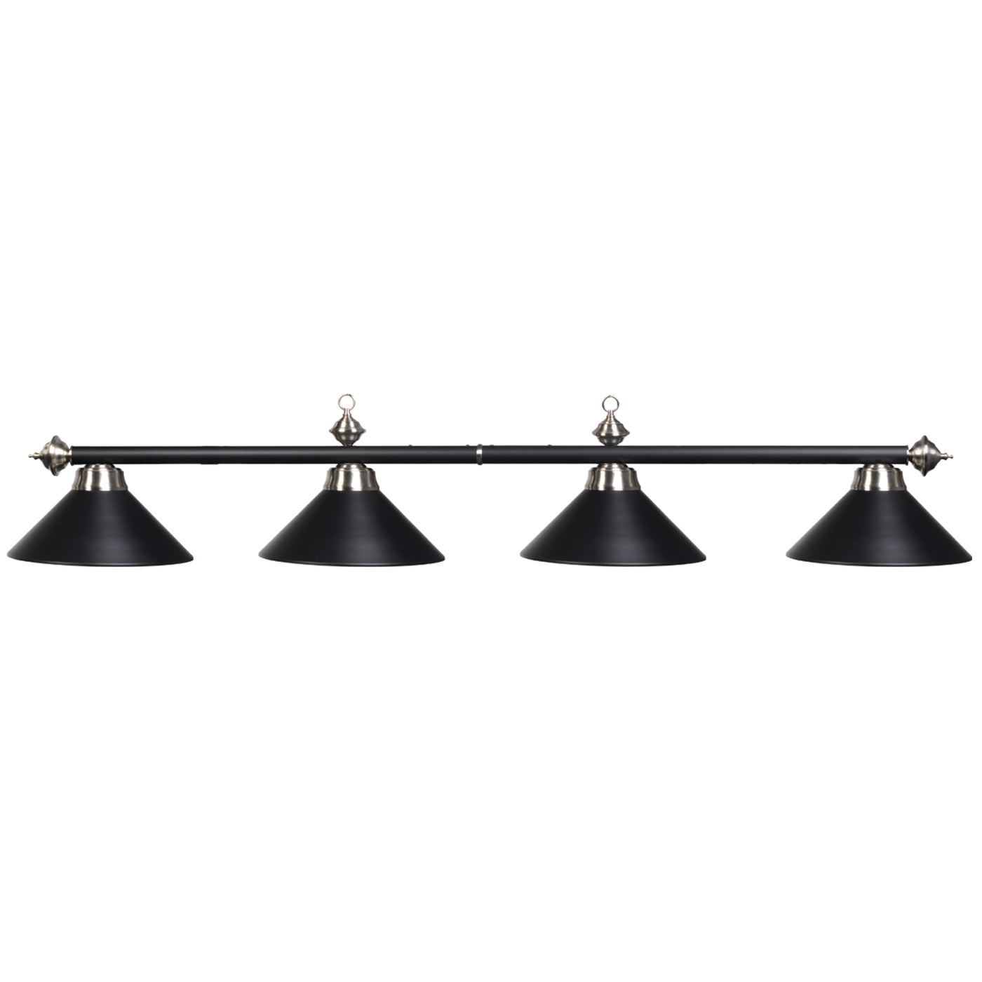 A linear design specifically designed to illuminate a pool table, this metal four-light billiards island pendant is set in a metal framework, finished in a matte black with stainless accents that matches its shades and makes a dramatic impact. Made up of materials, Metal Bar, Metal Shades. Manufactured by RAM Game Room. Manufactured in Country of United States.