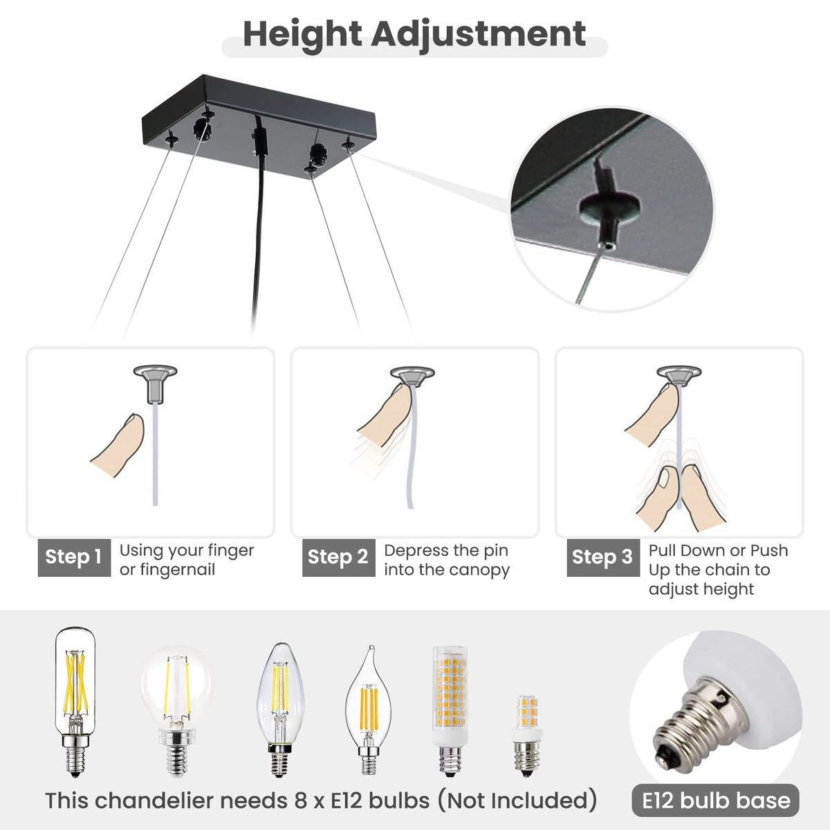 - **Dimmable Lighting**: This chandelier accommodates 8 E12 bulbs (not included) with a maximum wattage of 40W each, providing versatile lighting options. Fully dimmable when paired with compatible dimmer switches, you can create the perfect mood for any occasion.