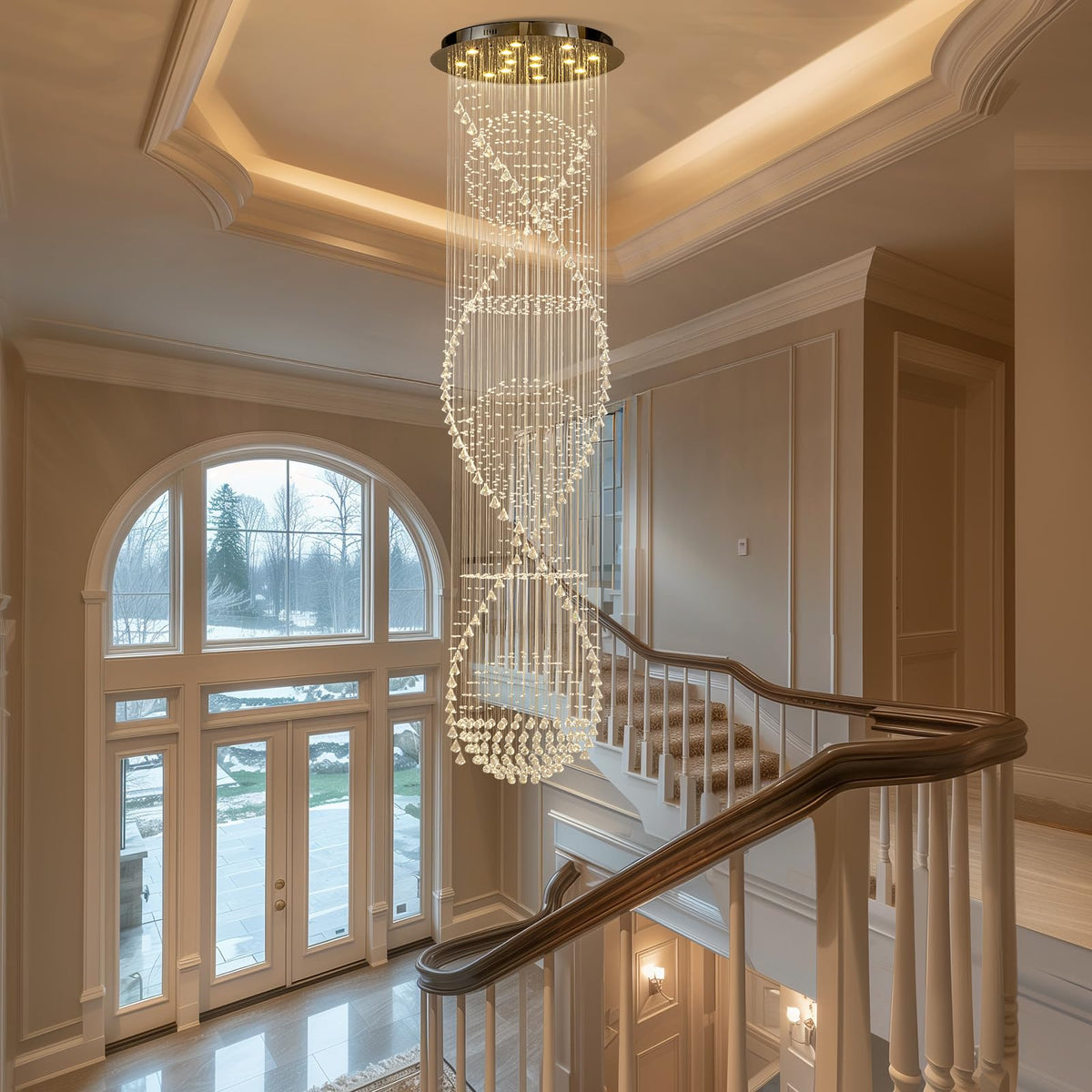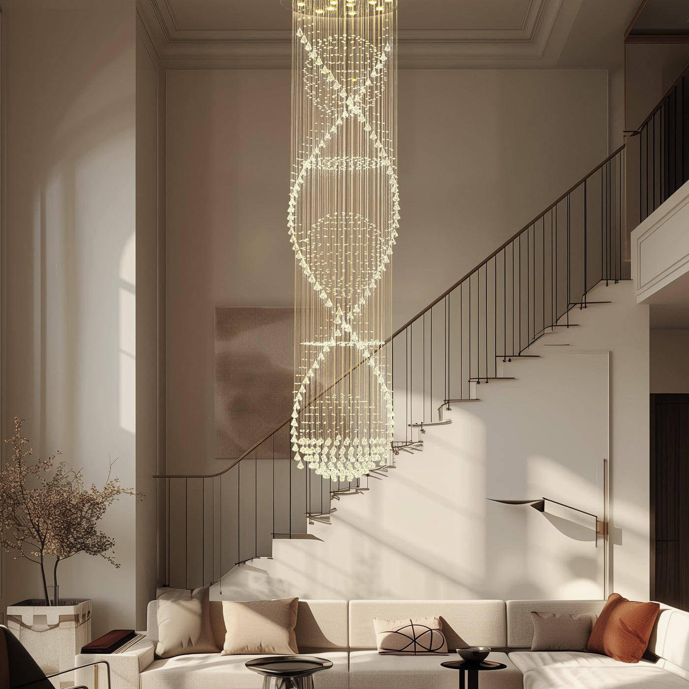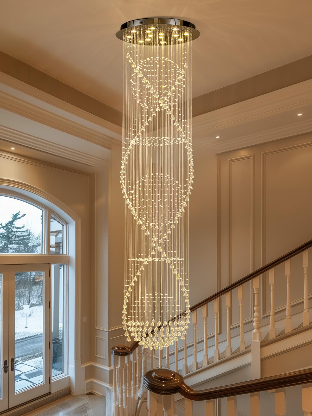 Elevate your space with the stunning 7PM modern crystal chandelier, designed to create a luxurious ambiance in any setting. This eye-catching lighting fixture features an elegant design that combines three unique K9 crystal spheres and spirals, making it perfect for high ceilings and grand staircases.