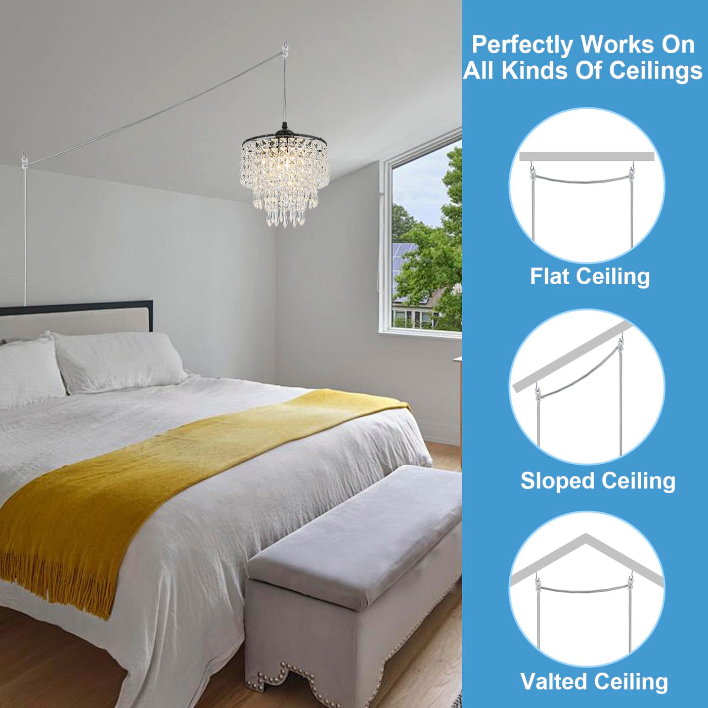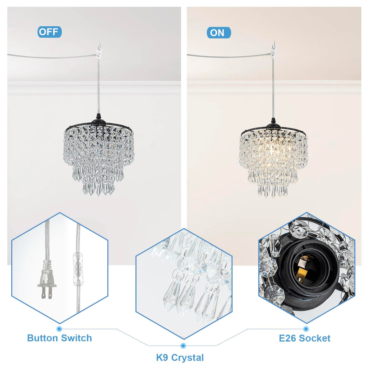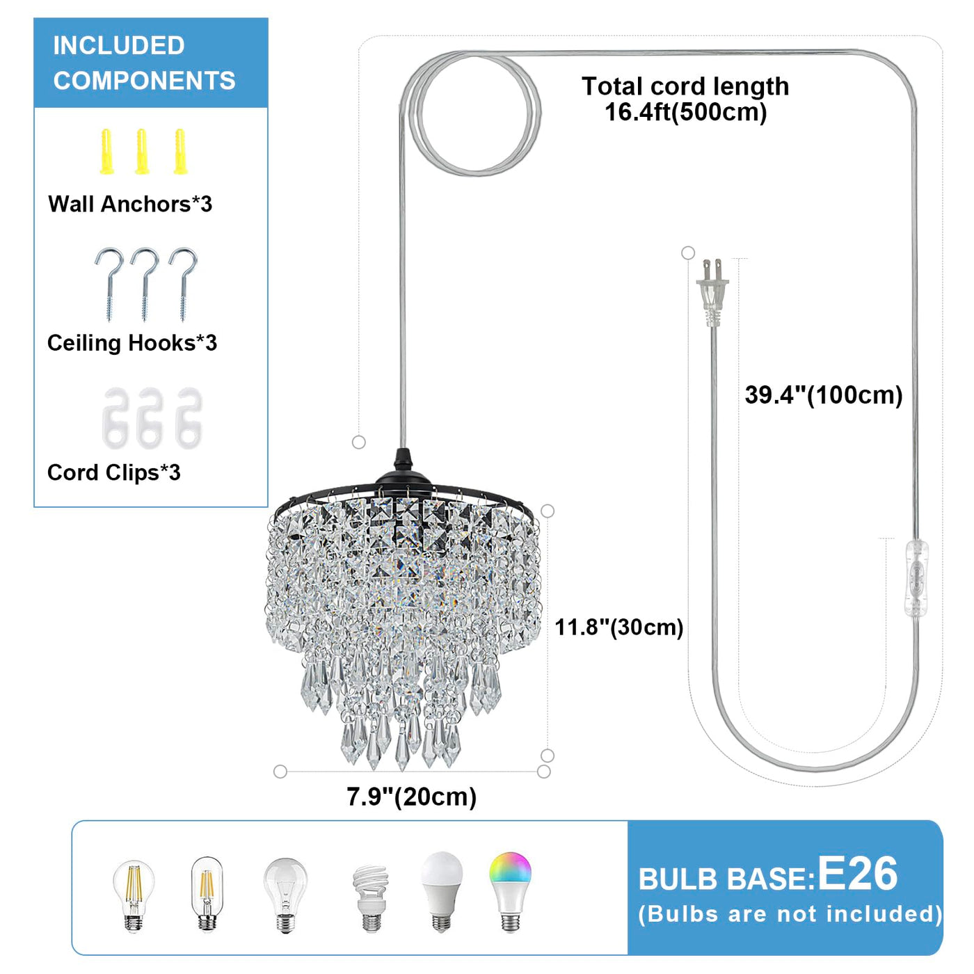 Crystal Plug In Pendant Light: this modern chrome chandelier is made of high quality crystal and round sturdy metal, featuring with 3 tier of crystals, you can see the sparkles in every angles, it can meet your lighting and decoration needs at the same time. Convenient to Use: this plug-in haning light can be used in flat ceiling, sloped ceiling and valted ceiling. Super easy to use, you can plug it in any socket anytime, anywhere, it is perfect for bedroom, study or bathroom. This plug in pendant light is the best choice to any of your room. Dimension and Bulb Requirement: lampshade diameter 7.8 inches, height 11.8 inches, hanging cord length 16.4 ft, needs 1 piece of E26 light bulb, max 60W, 85-265V, recommend using Incandescent/ LED/ CFL/ Halogen bulb (Bulb Not Included). No Need Assembling: the chandelier crystals are preassembled before packing, package contains 1 x plug in pendant light with 16.4 ft cord, 3 x Wall Anchors*, 3 x Ceiling Hooks, 3 x Cord Clips. Bulb is not included. 100% Asured Customer Service: we aim to provide you with high-quality ceiling light fixture and professional service, if you have any questions about the chandelier or you need free replacement, please feel free to contact us at anytime, we will reply you email in less than 12 hrs.