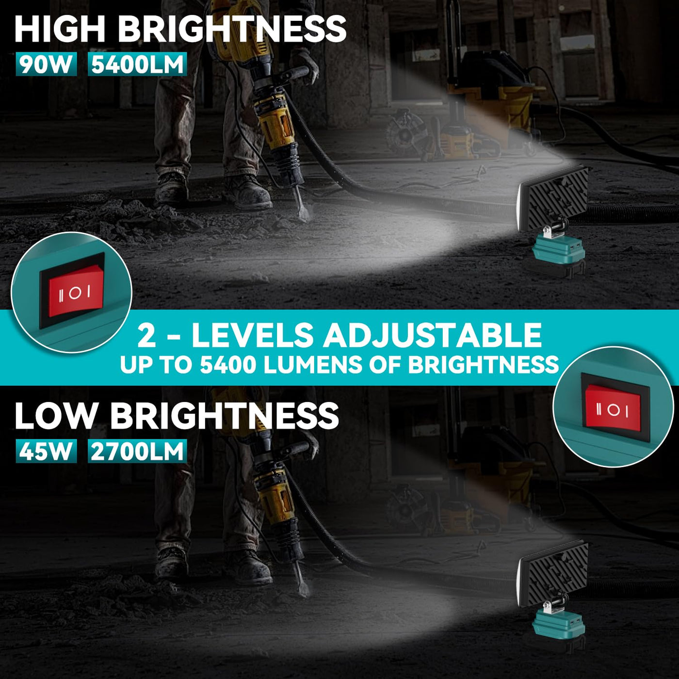 Q: What are the brightness levels of this LED work light?A: The LED work light features a 2-level adjustable gear, providing light flux of up to 90W and 5400 lumens. You can switch between high and low brightness to suit different working conditions.