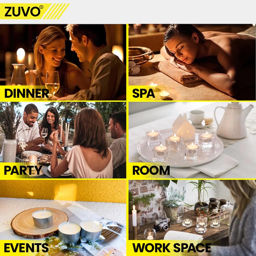 Q: Are these tea light candles smokeless and unscented?A: Yes, the Zuvo tea light candles are smokeless and unscented, providing a clean burning experience that is ideal for any occasion without overwhelming fragrances.