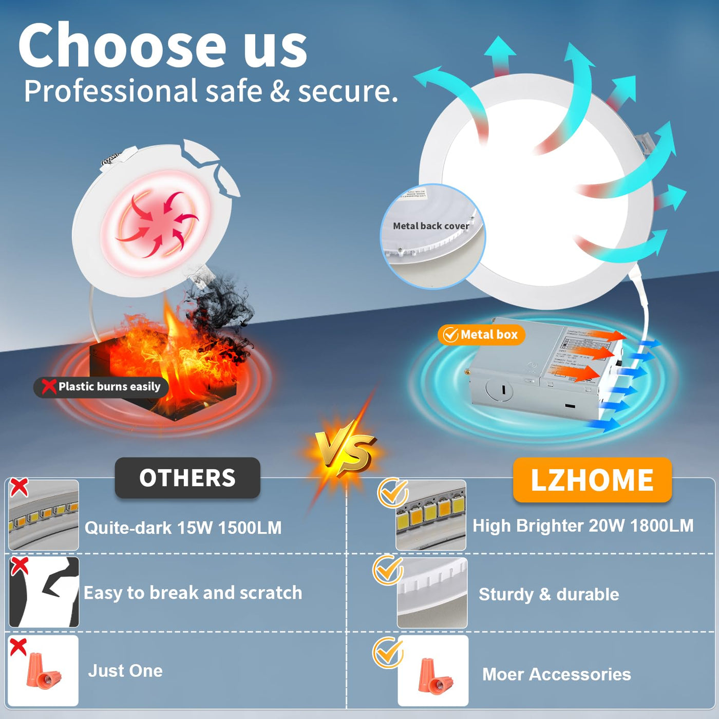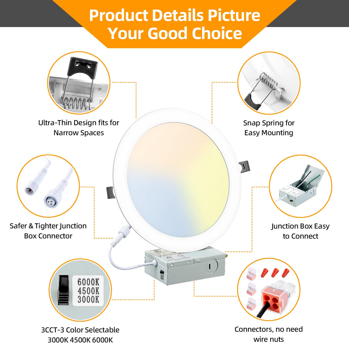 From The Led Recessed Lighting Manufacturer This Lzhome Ultra-Thin Recessed Downlight With Junction Box Is Compatible With Most Dimmers On The Market. Recessed Can Is No Longer A Limitation For Your Choice. 5%-100% Dimming Meets Kinds Of Your Needs In Applications, And The Color Temperature To Any Level From Warm White To Cool White 3000K-4500K-6000K. ?How To Install The Led Recessed Lighting Installation Instructions. Step1: Cut 8.1-Inch(20.6Cm) Hole In The Ceiling. Step2: Place The Junction Box In And Connect The Corresponding Wires. Step3: Put The Box In The Ceiling Hole. Push Up The Spring Clips. Step4: Push The Light Into The Ceiling. ?Ultra-Thin Recessed Lights Features: ?Dimmable 5%-100% And 3Cct Color Temperature Adjustable. ?1800Lm High Brightness. ?.No Flicker And Noise. ?.Wide Applications As Living Room, Bedroom, Kitchen, Study Room And More. ?The 8Inch Downlight Attention: 1. Please Kindly Read The User Manual Before Installation 2. The Ceiling Lights Are Not Waterproof And Are Suitable For Indoor 3. Any Questions Or Problems, Please Feel Free To Contact With Us, We Will Provide The Solutions ?The Recessed Light Product Parameters: ?Input Voltage: Ac 108V-132V 60Hz ?Lumens: 1800Lm ?Beam Angle: 160 ?3Cct Select: 3000K-4500K-6000K ?The Downlight Application: -Widely Used For Living Room, Bedroom, Kitchens, Closets, Stairwells, Basements, Restrooms, Etc. ?Whats In The Package: -6 X Led Recessed Light -6 X Junction Box -1X User Manual -18 X Connector -18 X Wire Nuts