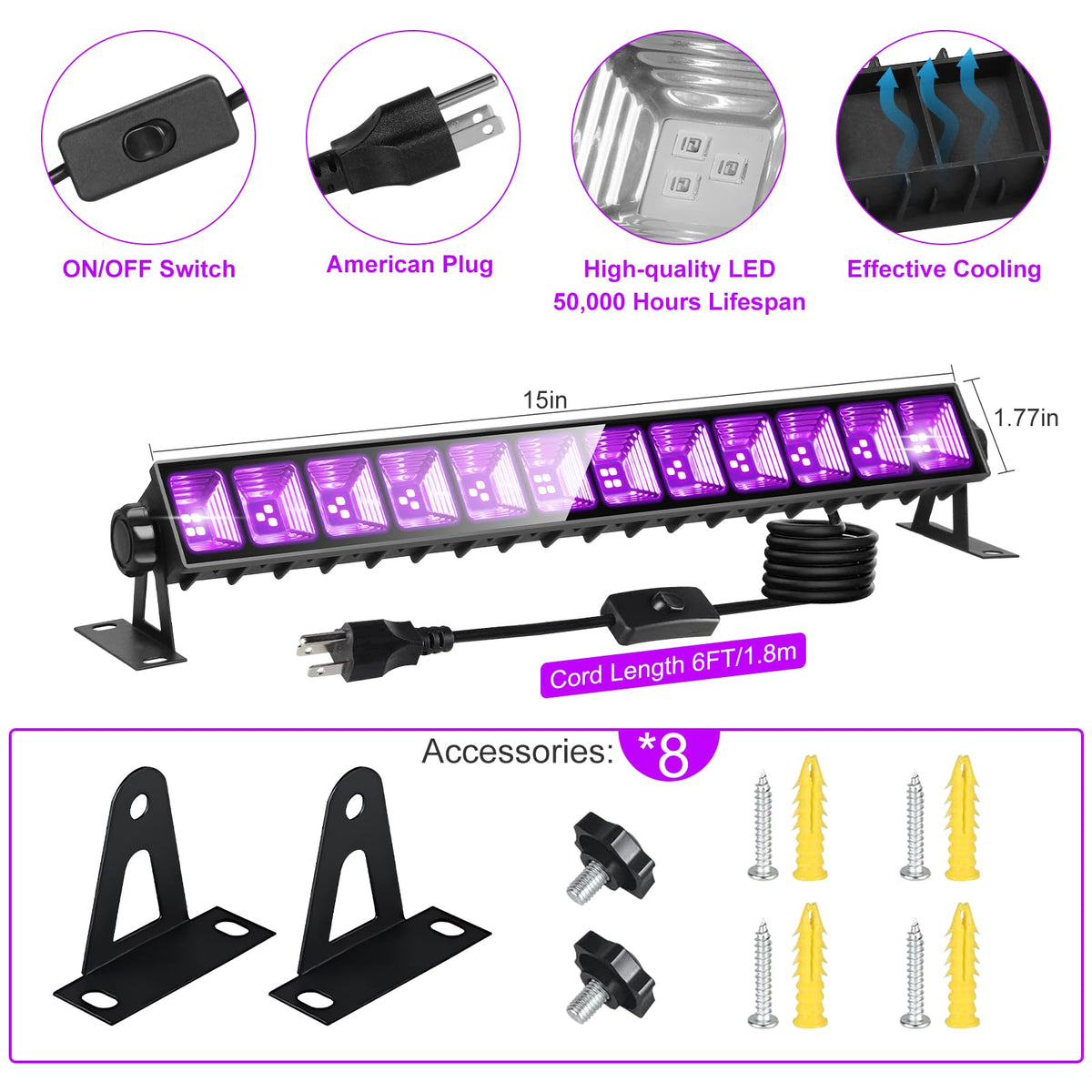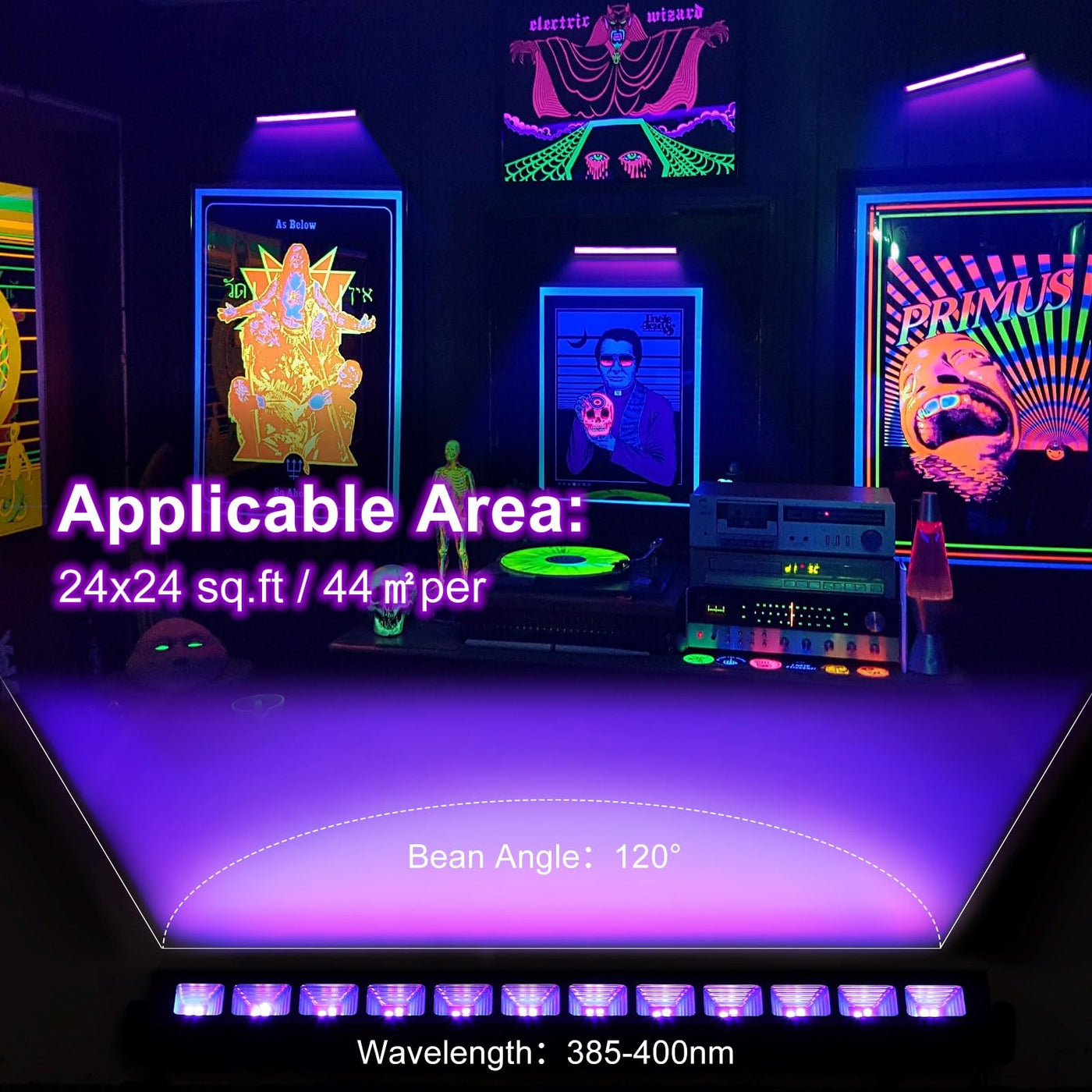 Specifications: Wattage: 40W Power Cord Length: 6.0ft Plug: Standard US Plug Input Voltage: 120V AC Beam Angle: over 120° Type of Bulb: LED Material: Aluminum + Tempered Glass MAX Working Temperature : 55? / 131? Wavelength: 385-400nm Each Lighting Coverage: 24 x 24 ft40W LED black light bars are nice, lots of glow from anything in the room that is Blacklight reactive. The LED black lights will add a touch of fun and do an amazing job at lighting everything up.8 pack LED black lights are good for bedroom, glow party, Halloween.Using the blacklights bar every year brings funny and spooky Halloween glow.