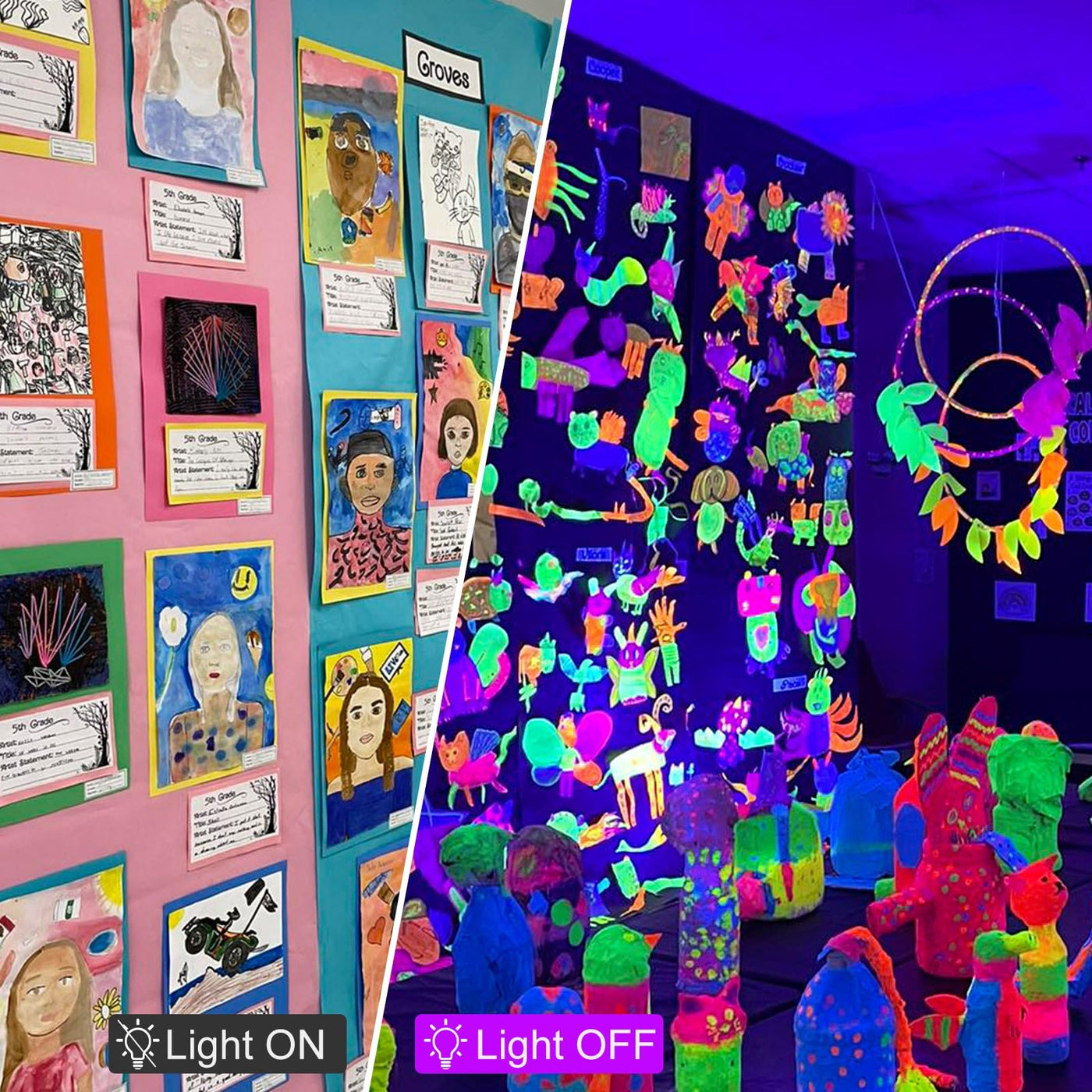 Q: What types of events can I use the black light for?A: This black light is perfect for a variety of events, including Halloween parties, glow parties, club events, art galleries, birthdays, weddings, and Christmas celebrations. It transforms any space into a vibrant and exciting atmosphere.