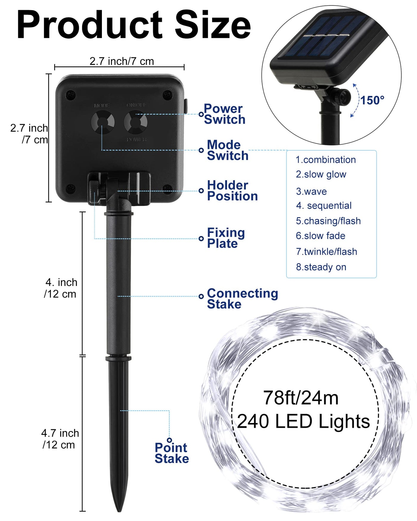 LED color: as pictures shown Quantity of product: 8 pack garden lights, each 78 ft, 240 LED solar strings lights, 8 pack ground stake Battery type: 800mAh ni-mh battery Switch: on/ off, mode Working mode: 8 lighting modes Material: plastic and copper wire Charging time: 3 hours Working hours: 10 hours Bulb spacing: 3.94 inches IP grade: IP44 waterproof Power supply: solar energy Wire: pure copper