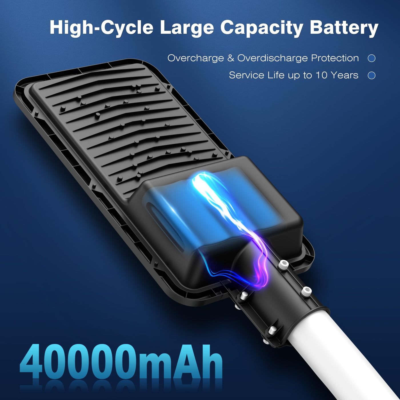 Q: What are the key features of the 8000W Solar Street Lights?A: The 8000W Solar Street Lights feature 180,000 lumens of brightness with a 6500K color temperature, providing illumination for areas up to 2900-3100 square feet. They include 75 high-brightness 5054-SMD LED beads, are made of durable ABS and die-cast aluminum, and are IP66 waterproof. They also come with a high-efficiency solar panel and a 40,000mAh battery for reliable performance.