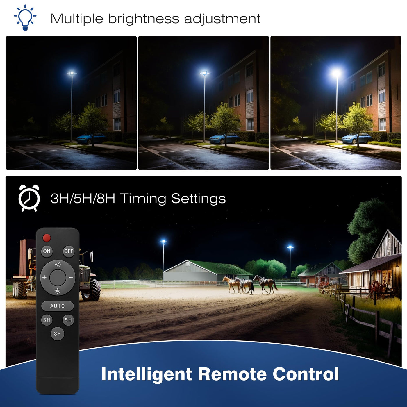 Q: How do the solar lights operate at night?A: These solar lights automatically operate from dusk to dawn, providing continuous illumination throughout the night. The remote control allows users to turn the lights on/off, adjust brightness levels, and set timers for 3, 5, or 8 hours of operation.