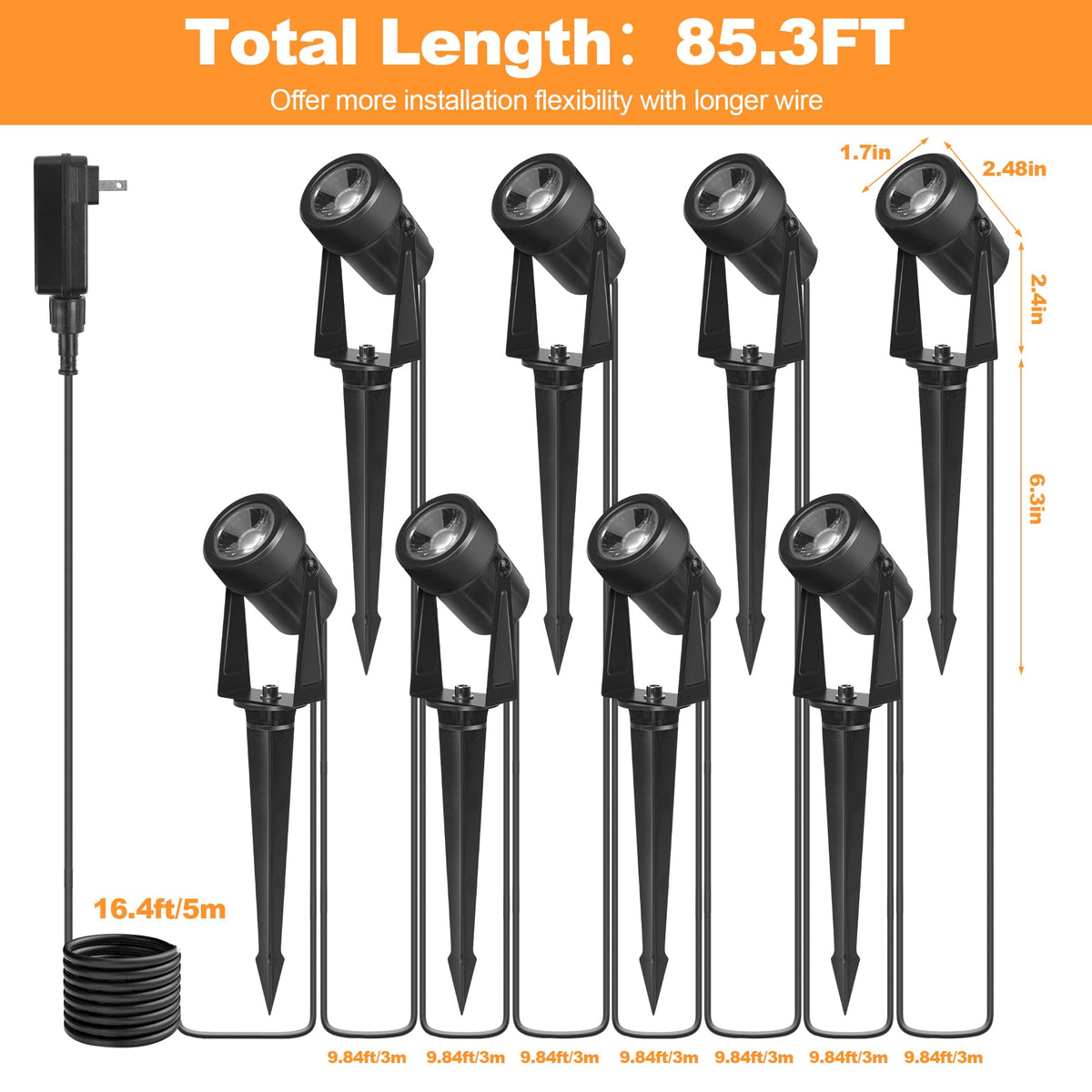 Q: What is the power consumption of the 85.3FT LED Outdoor Landscape Spot Light?A: The entire set of the LED outdoor landscape lights consumes only 24W, with each individual light consuming 3W, making it an energy-efficient option for illuminating your outdoor spaces.
