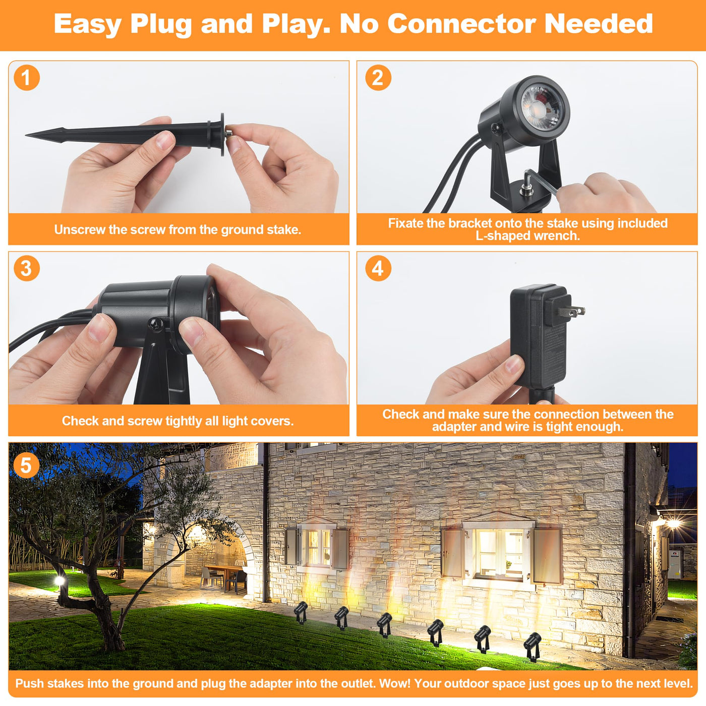 Q: What kind of light do these spotlights emit?A: These landscape lights emit a warm white light at 3000K, creating a cozy and inviting atmosphere suitable for enhancing various outdoor landscapes such as gardens, pathways, and patios.