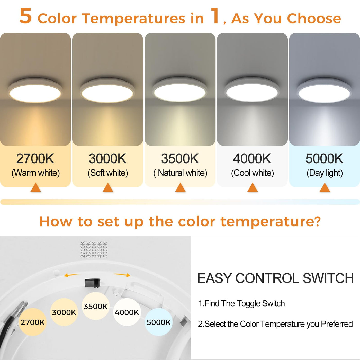 Q: What are the different color temperatures available for the 8PACK Flush Mount Ceiling Light?A: The 8PACK Flush Mount Ceiling Light offers three adjustable color temperatures: 3000K (warm white), 4000K (neutral white), and 6500K (daylight white). You can easily switch between these settings by sliding the button on the back of the light.
