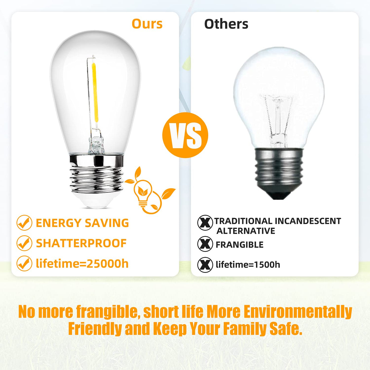 Q: What are the benefits of using LED outdoor string lights?A: LED outdoor string lights are energy-efficient, consuming only 1W while providing the equivalent brightness of a traditional 10W Edison bulb. They also have a long lifespan of up to 25,000 hours, which means less frequent bulb replacements and lower electricity costs.