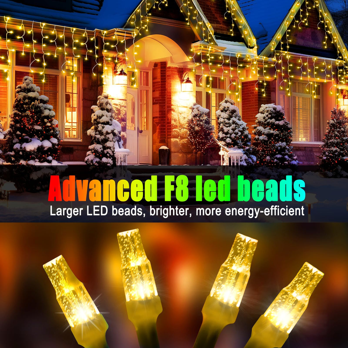 Q: What are the different lighting modes available for these Christmas lights?A: These Christmas lights feature 8 different modes including Combination, Wave, Sequential, Slow Glow, Chase, Fade, Flicker, and Constant, allowing you to set the perfect ambiance for any occasion.