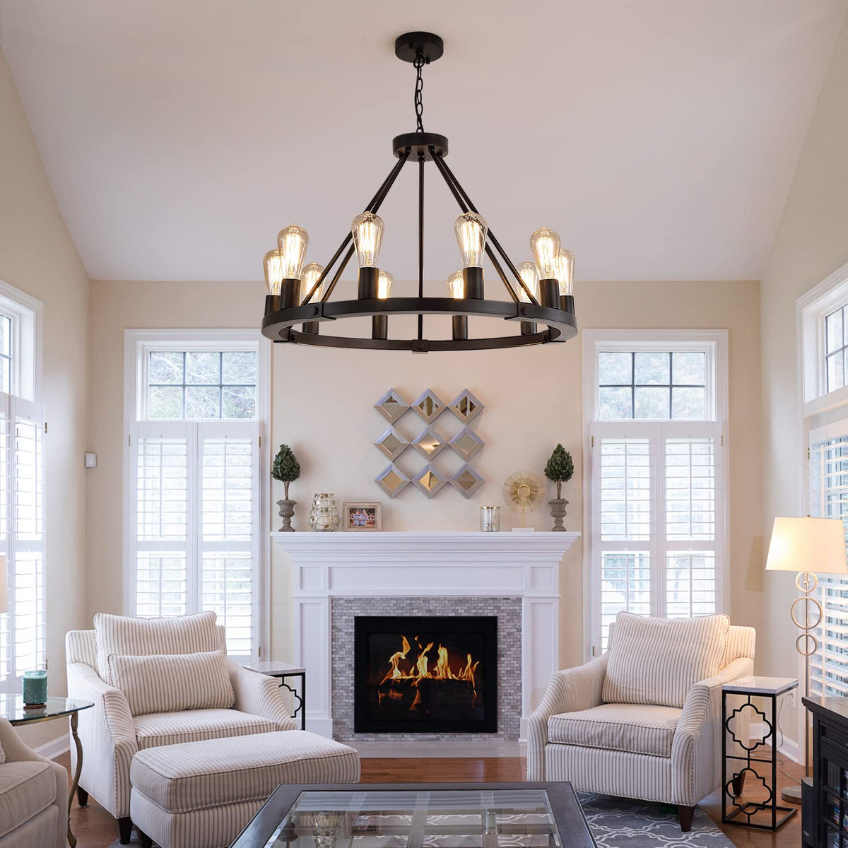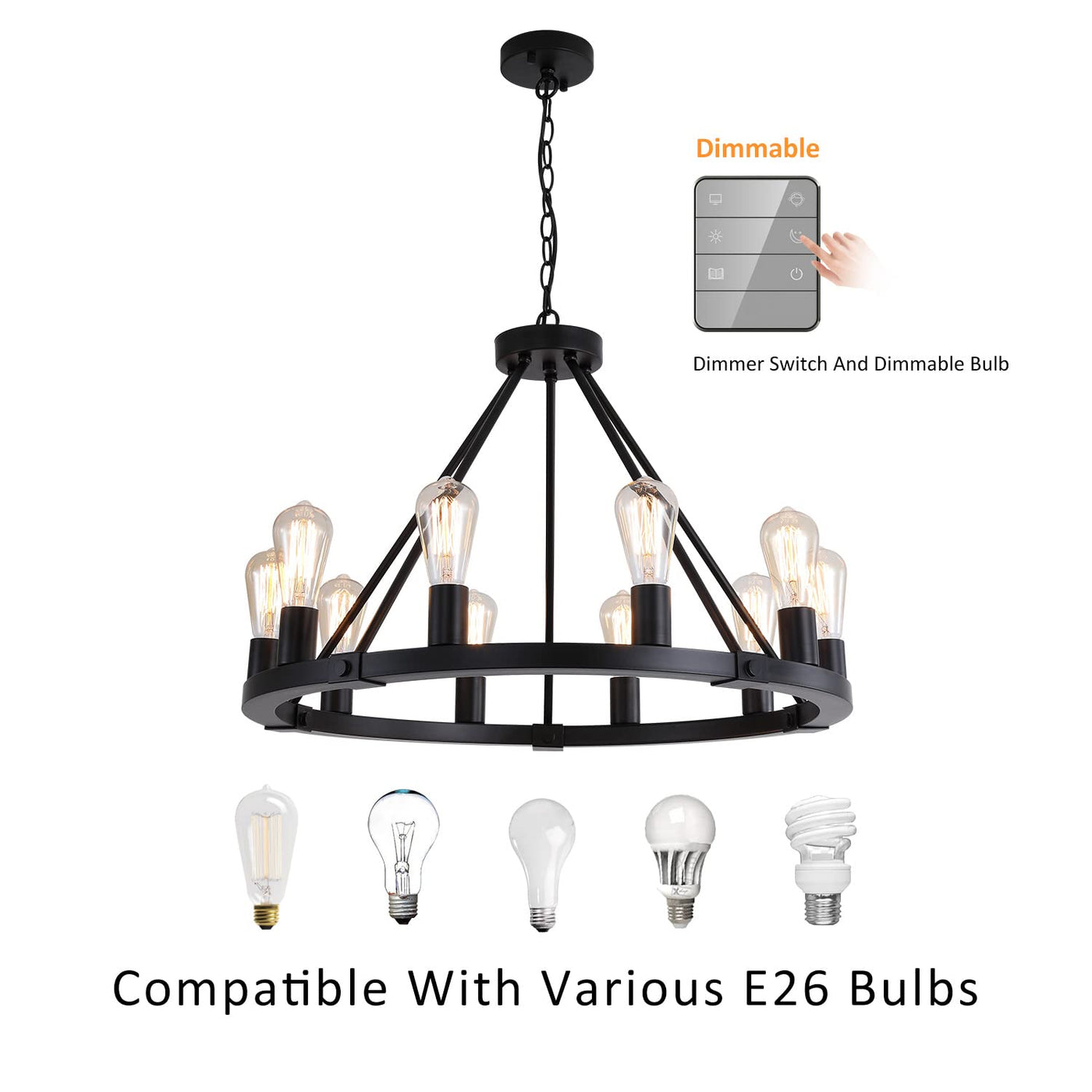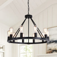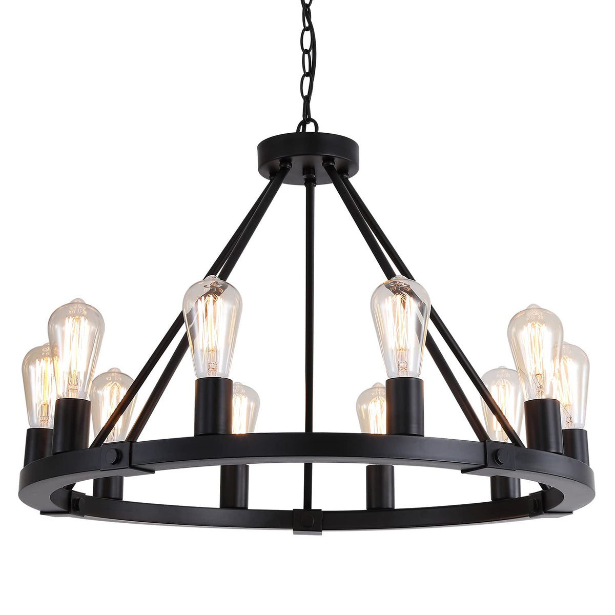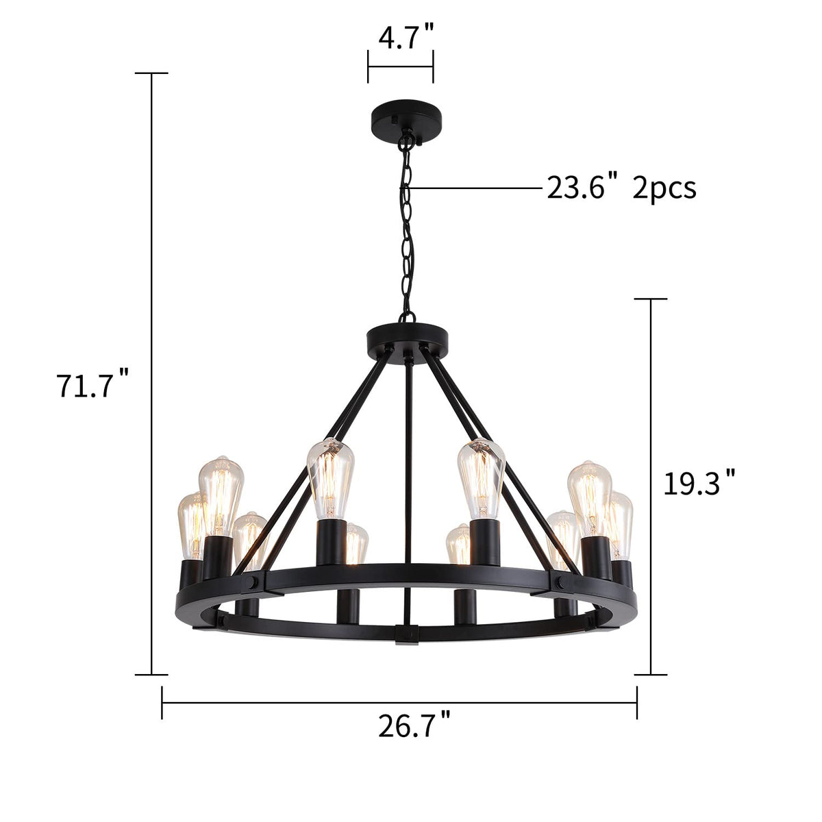 9Mmml 10 Lights Wagon Wheel Chandelier, Black Round Globe Wrought Iron Pendant Lights For Dinging&Living Room Kitchen Island Por