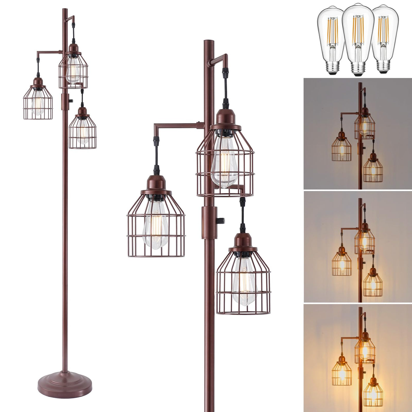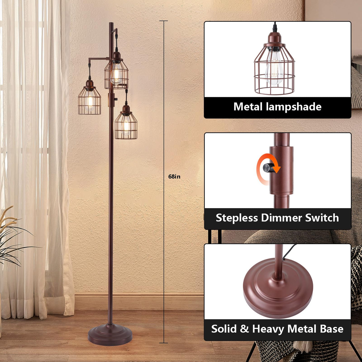 9Mmml Floor Lamp For Living Room, Farmhouse Industrial Dimmable Floor Lamp, 3 Lights Metal Cage Tree Standing Lamp,68'', 3Pcs Le