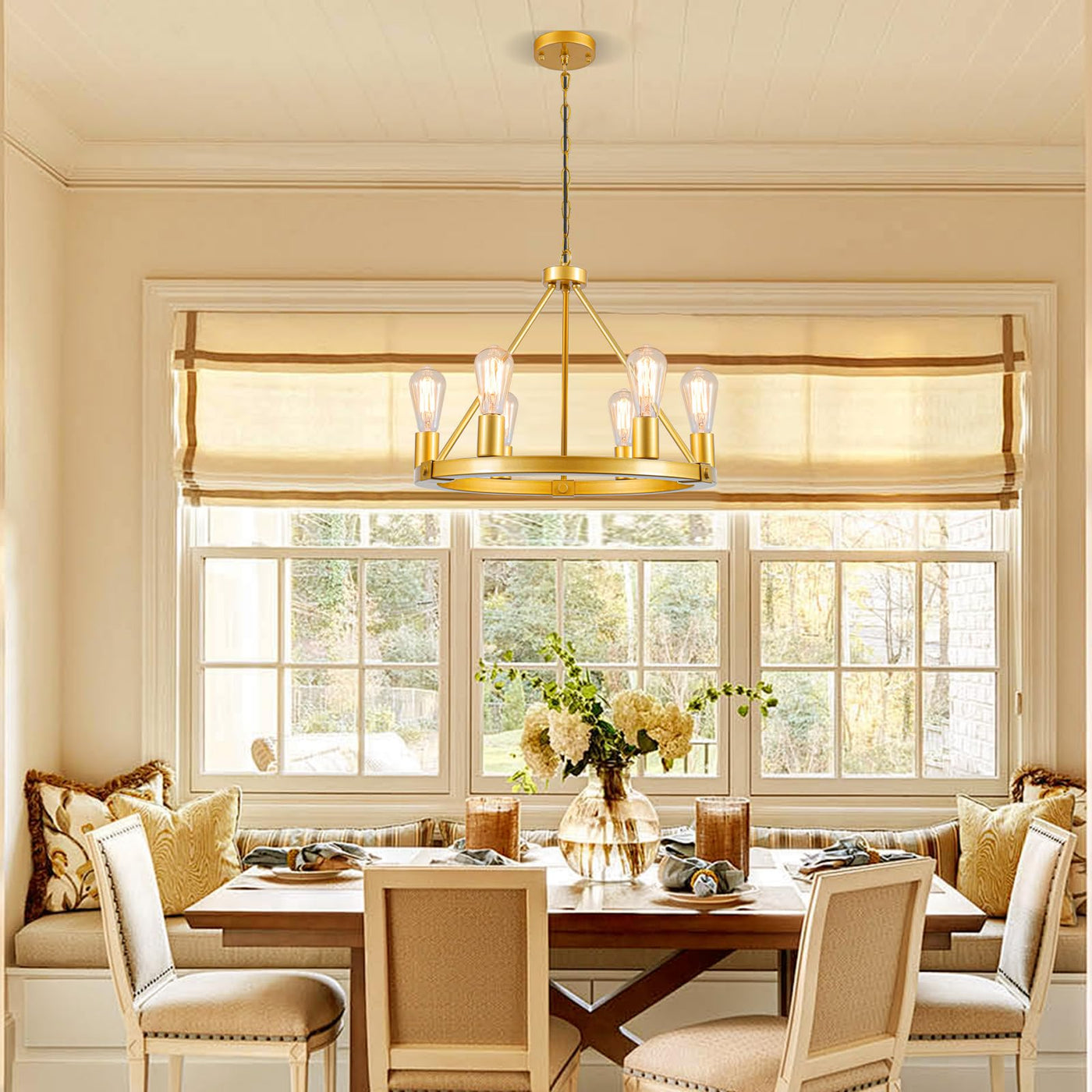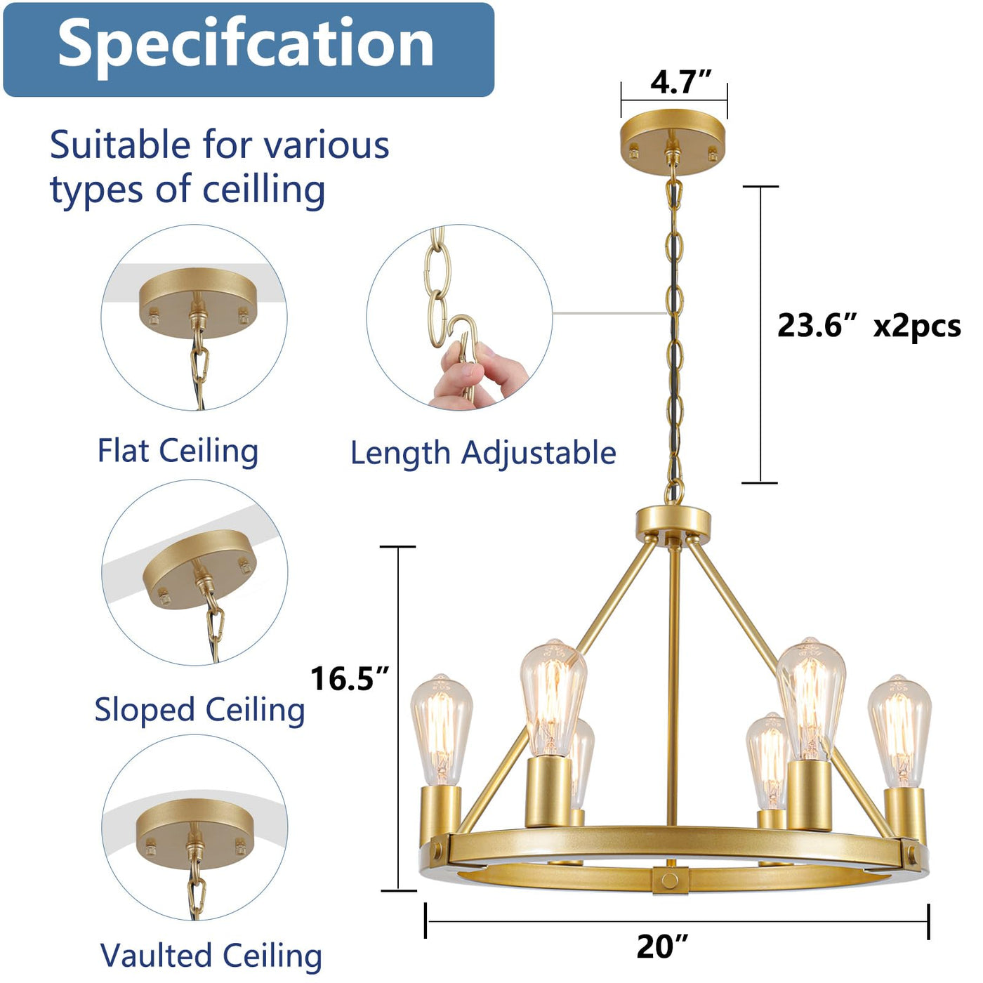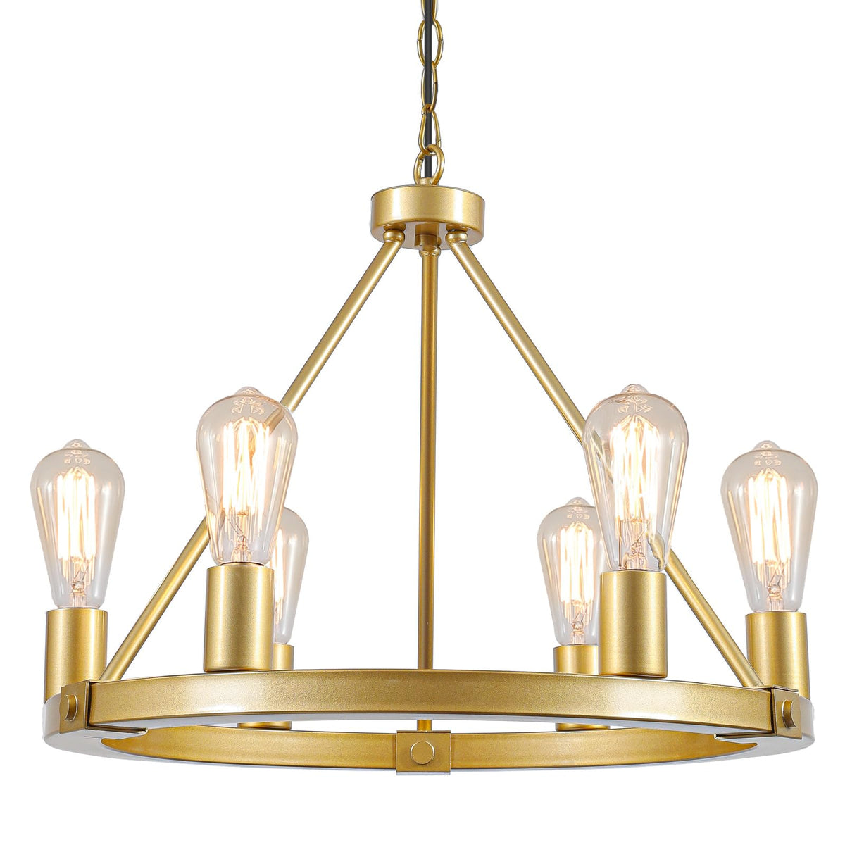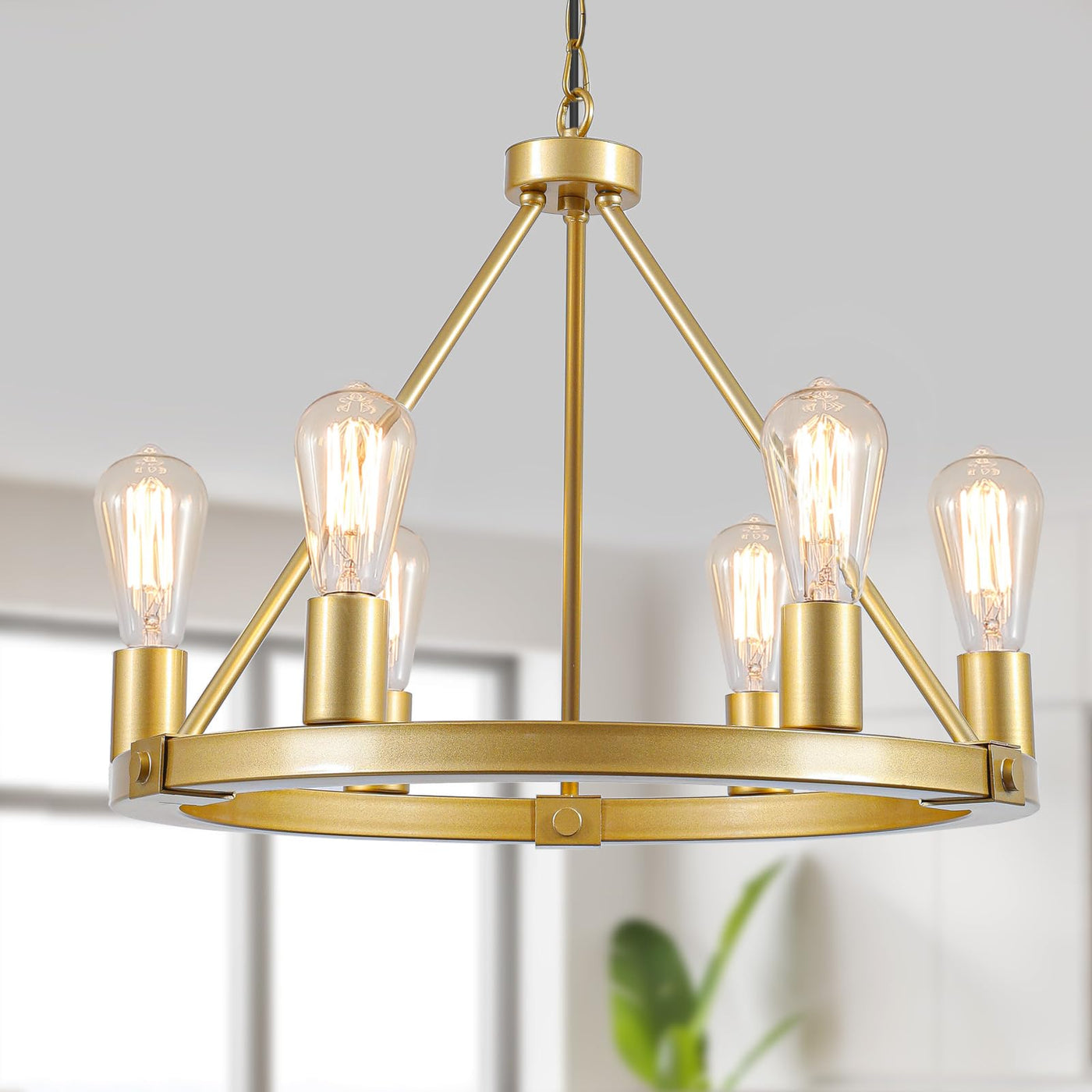 9Mmml Gold Wagon Wheel Chandelier, 6-Light Industrial Pendant Light, 20'' Farmhouse Ceiling Hanging Chandelier Light Fixture For