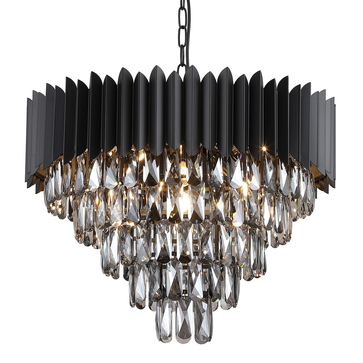 Crafted with a enhanced black metal frame, this chandelier features a captivating design with five tiers and twelve lights. The chandelier showcases select smoke K9 crystals that create a vintage and elegant look, enhancing your home decor while providing a beautiful lighting effect. The modern design offers versatility, making it suitable for both high and lower ceilings. The adjustable metal chain allows you to customize the height up to a maximum of 35.5 inches, making it easy to adapt to different spaces.
