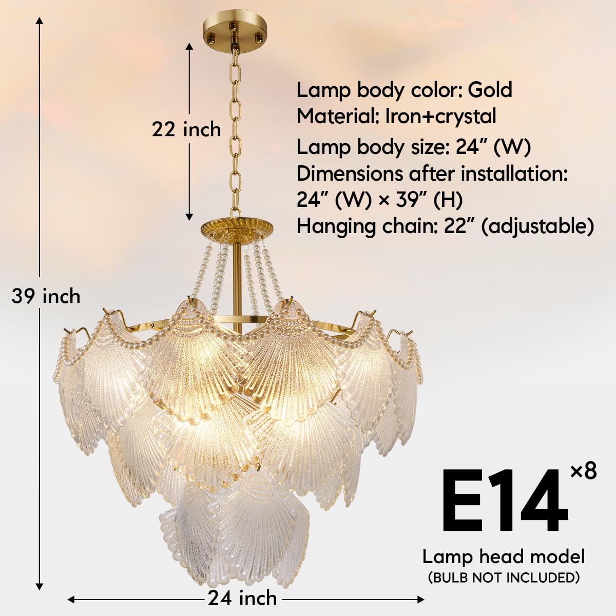 Specification: Diameter 24 inches Height 40 inch. Chain length 21.6 inches, adjustable Bulb type: 8 x E14 bulbs Voltage: 110V Wattage: 40W(MAX) Design: Modern Number of Tiers: 4 Material: Top grade clear crystals and metal Instruction manual is included Suitable for most Dining Room, Living Room, Bedroom, Kitchen Island, bathroom, Hallway, Hotel, aisle, Staircase, Foyer, Hallway, Office, loft, attic, terrace, restaurant, cafe, bar,... Package Included: 1 x Crystal chandelier 1 x Screws sets 1 x Instruction 1 x gloves About installation: It takes some time to hang the crystal bar. When the chandelier lights up for a moment, everything is worth it. After-sales and design: A limit crystal hook is included in the package to make the crystal hang neatly. Its exquisite aesthetic space, if you have any questions, please feel free to contact us.