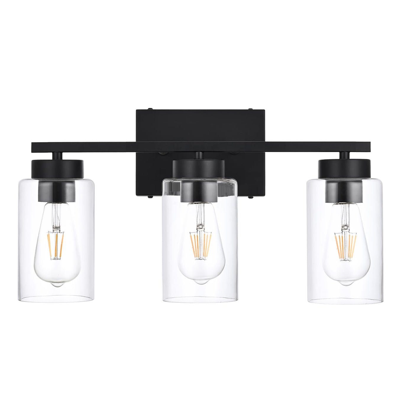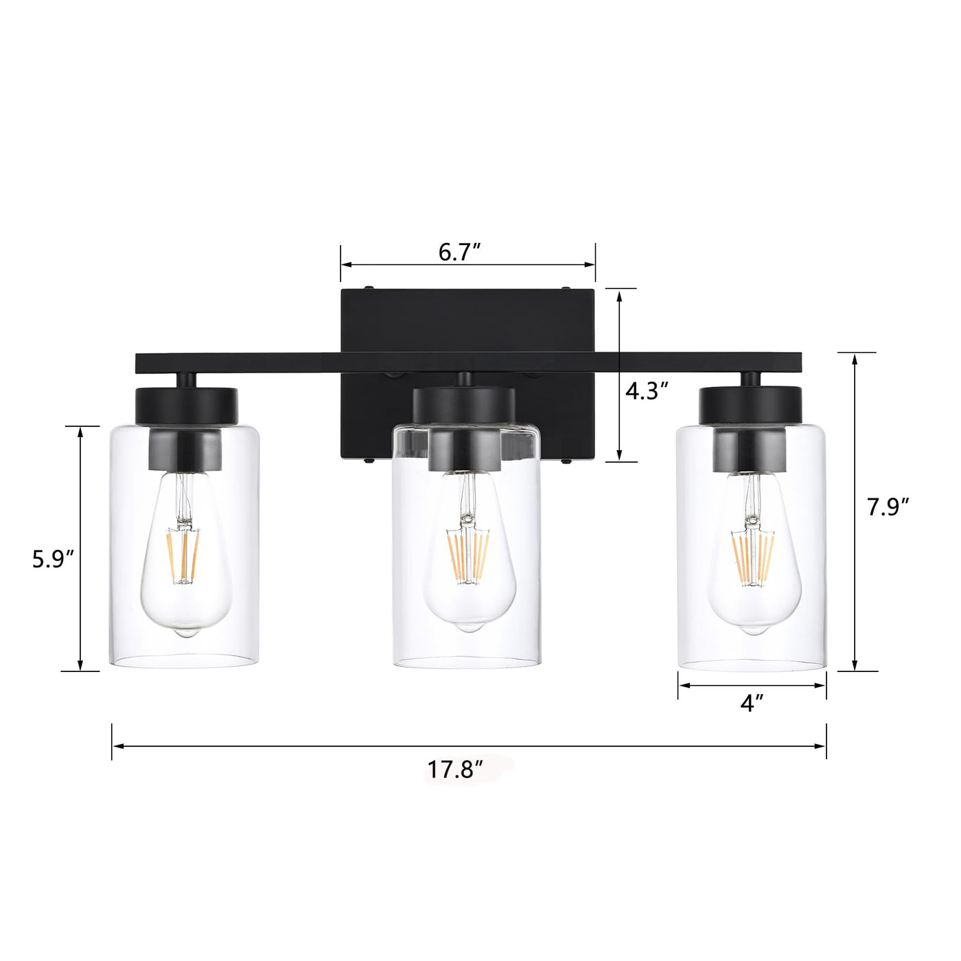 3-Light Up or Down Vanity Lights with Glass Shade The bathroom light comes in a matte black and high quality clear glass shade, making this bathroom light modern, stylish and elegant on the mirror, perfectly for your bathroom, mirror cabinets, make-up and dressing room, bedroom and storage house etc. Lights with glass shadows can be installed up or down to illuminate every corner of the room. Easy installation with US square base. Premium Material & Durable Structure Crafted of the sturdy metal lamp body in matte black finish which is durable for years of use. No more worry about corrosion or color-fading, it is definitely a fantastic lamp for home decor. Clear Glass Lampshade Super transparent glass shades reflect and refract light to exquisite and opulent addition.It's easy for you to change the bulbs while providing enough illuminance throughout your house. Easy to Assemble This sconce light fixture is easy to install, all mounting hardware and instruction are included for quick installation. Description: Type: Simplicity/Vintage/Industrial/Farmhouse Features: Black Bathroom Vanity Lighting Fixtures Product Material: High-quality Iron Color: Matte Black Voltage: 110-120V Bulb Base: 3 X E26 (Bulbs not included) Light Direction: Up or Down Light Dimmable: Yes Net Weight: 3.3lb Dimensions This Bathroom Sconce Fixture Size: 10''(H) x 17.8''(L) x 5.9''(W) Rectangle Plate: 4.3''(H) x 6.7''(L) x 1''(W) Clear Glass Shade: 5.9''(H) x (D)4'' (Opening) Note: 1. In order to make the correct lighting installation, please read the instructions carefully before installing and save it for later reference. 2. Please measure the size of your space to ensure this is the right size light fixture that you need.