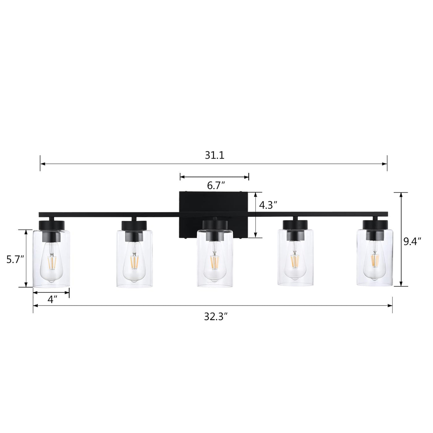 3/4/5 Up or Down Vanity Lights with Glass Shade The bathroom light comes in a matte black and high quality clear glass shade, making this bathroom light modern, stylish and elegant on the mirror, perfectly for your bathroom, mirror cabinets, make-up and dressing room, bedroom and storage house etc. Lights with glass shadows can be installed up or down to illuminate every corner of the room. Easy installation with US square base. Premium Material & Durable Structure Crafted of the sturdy metal lamp body in matte black finish which is durable for years of use. No more worry about corrosion or color-fading, it is definitely a fantastic lamp for home decor. Clear Glass Lampshade Super transparent glass shades reflect and refract light to exquisite and opulent addition. It's easy for you to change the bulbs while providing enough illuminance throughout your house. Easy to Assemble This sconce light fixture is easy to install, all mounting hardware and instruction are included for quick installation. Description: Type: Simplicity/Vintage/Industrial/Farmhouse Features: Matte Black Bathroom Vanity Lighting Fixtures Product Material: High-quality Iron Color: Black Voltage: 110-120V Bulb Base: 5 X E26 (Bulbs not included). Light Direction: Up or Down Light Dimmable: Yes Net Weight: 6.2lb Dimensions This Bathroom Sconce Fixture Size 9.4''(H) x 32.3''(L) x 6.3''(W) Rectangle Plate: 4.3''(H) x 6.7''(L) x 0.8''(W) Clear Glass Shade: 5.7''(H) x D4'' (Opening) Note: 1. In order to make the correct lighting installation, please read the instructions carefully before installing and save it for later reference. 2. Please measure the size of your space to ensure this is the right size light fixture that you need.