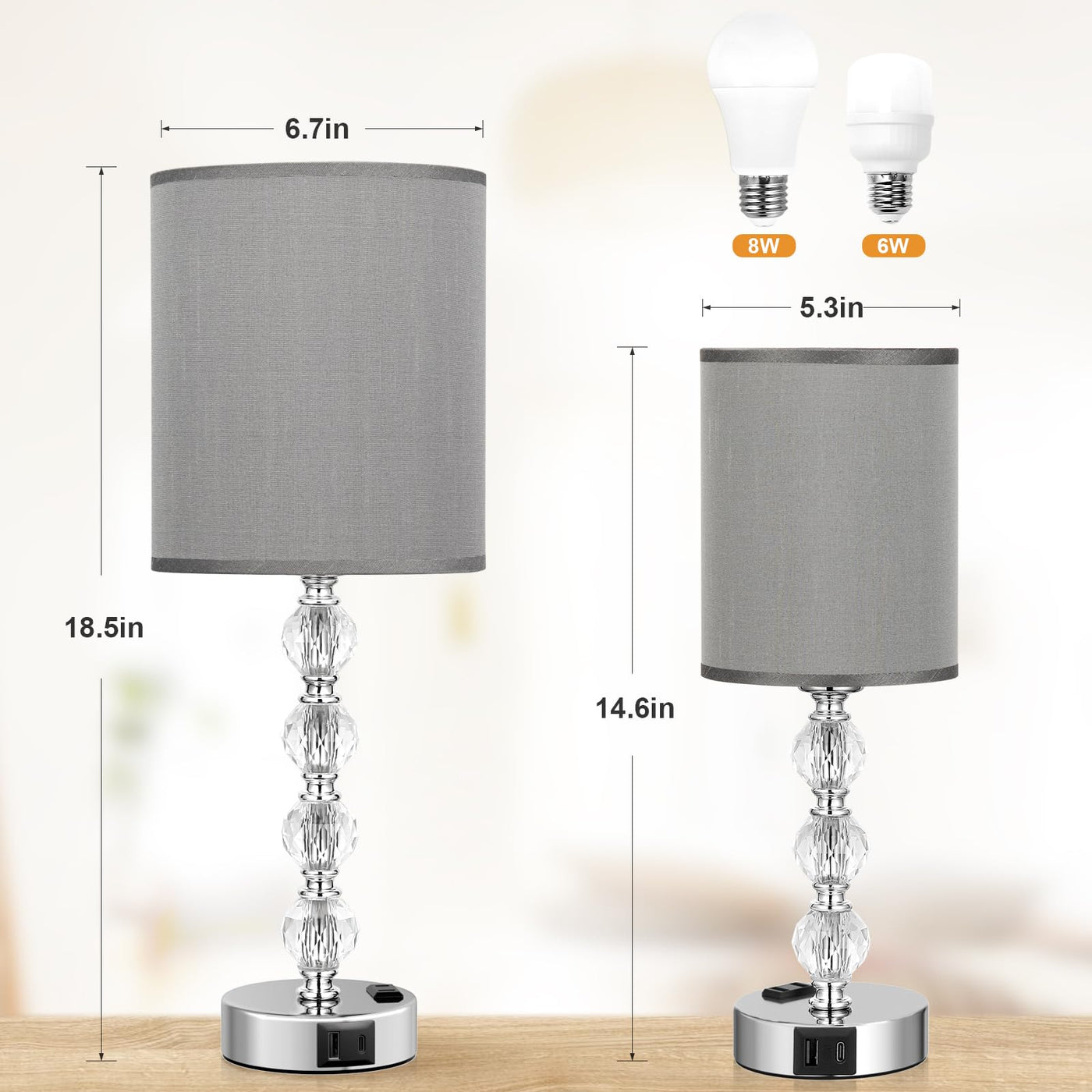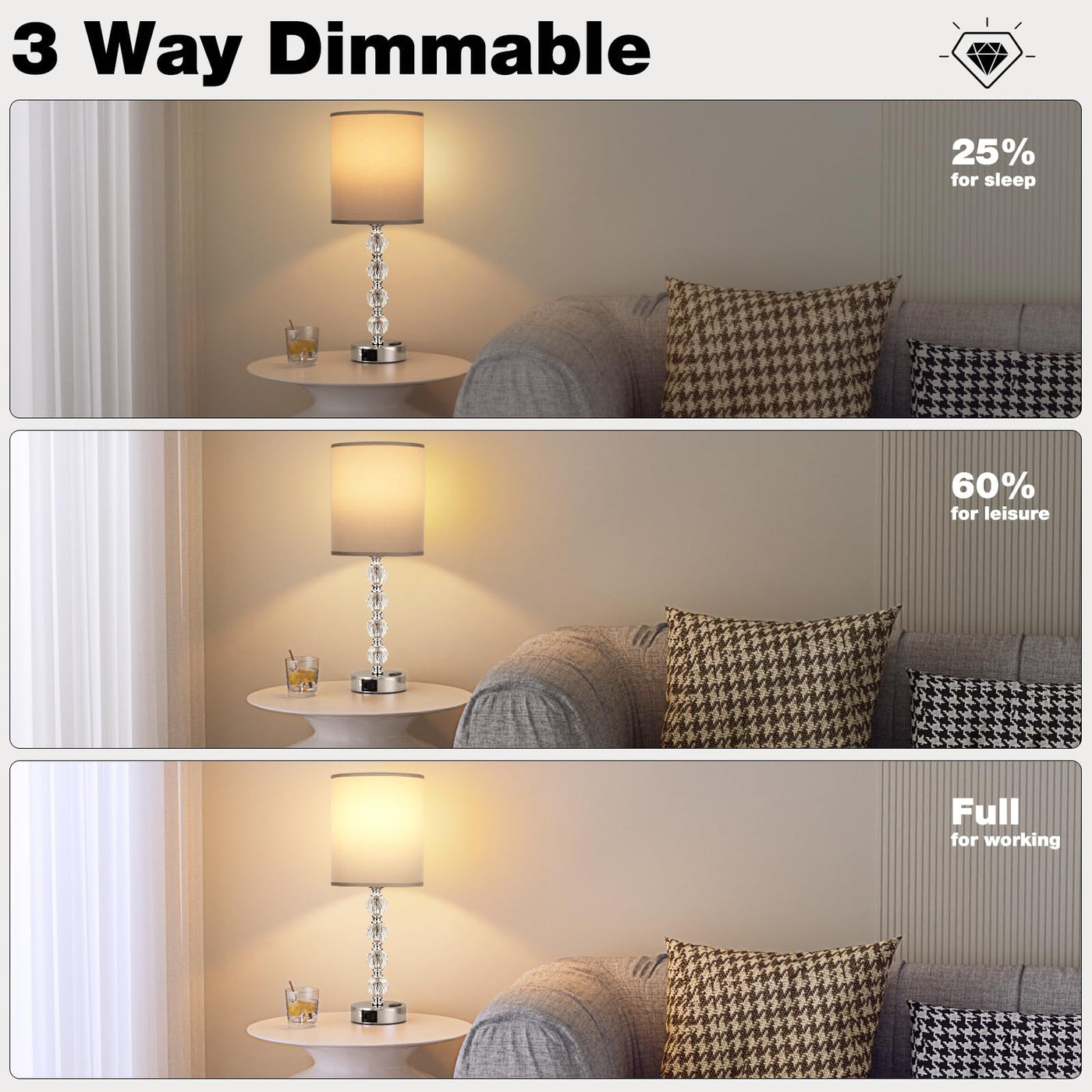 Acaxin Touch Bedside Crystal Lamps For Bedrooms Nightstand With Usb C+A Charging Port And Ac Outlet White, 3 Way Dimmable Silver