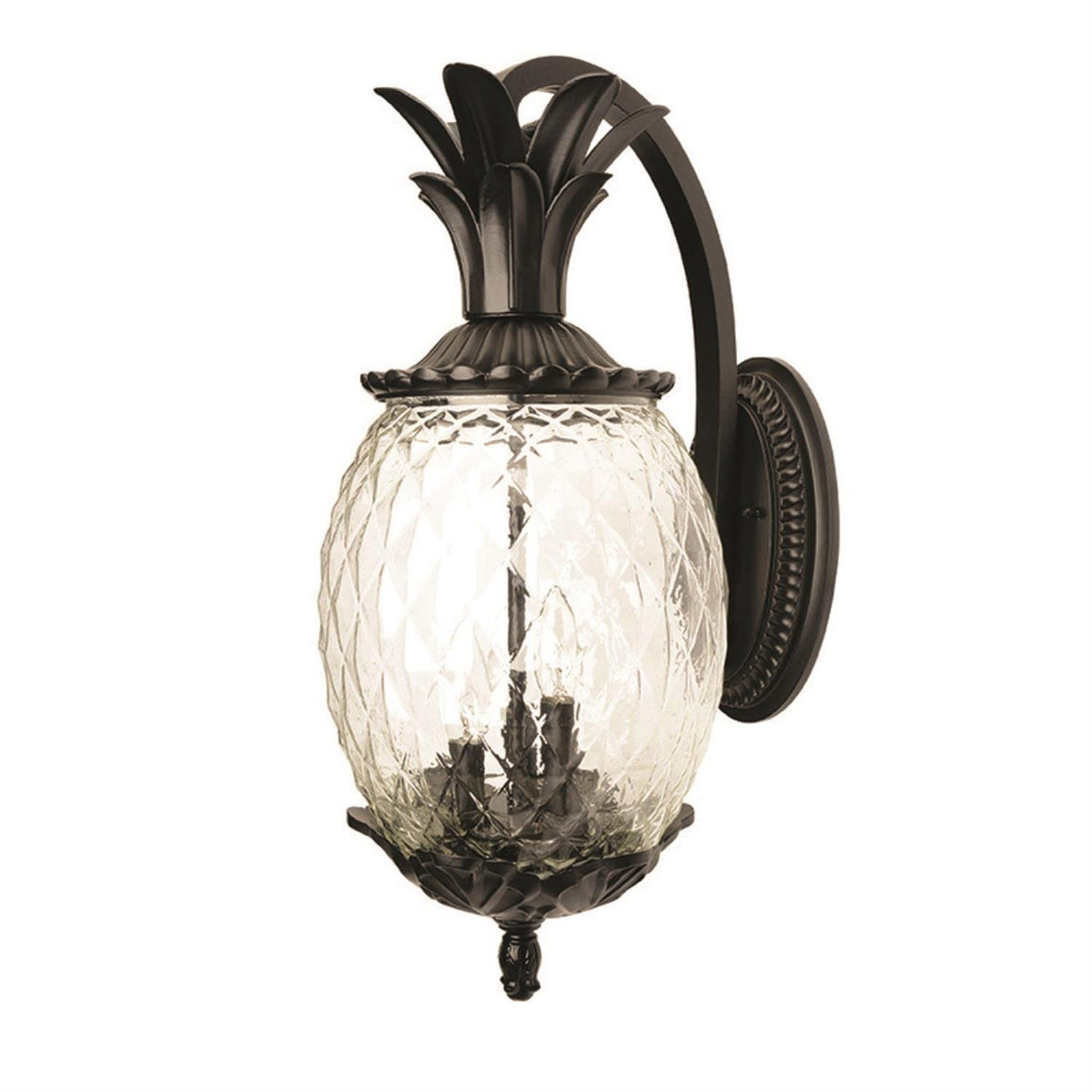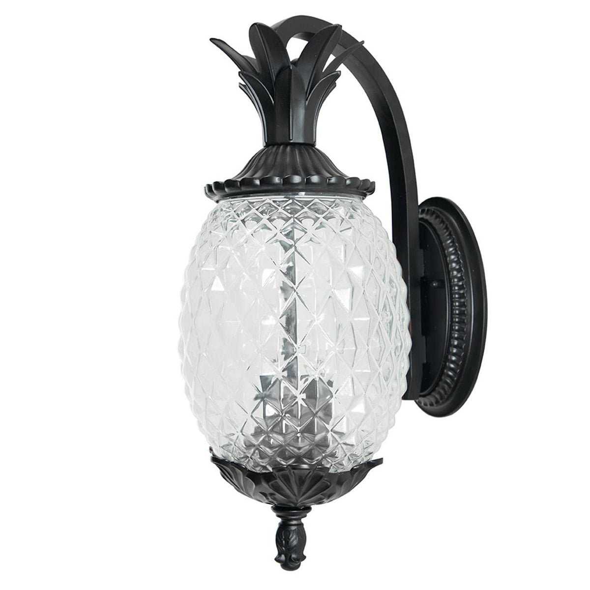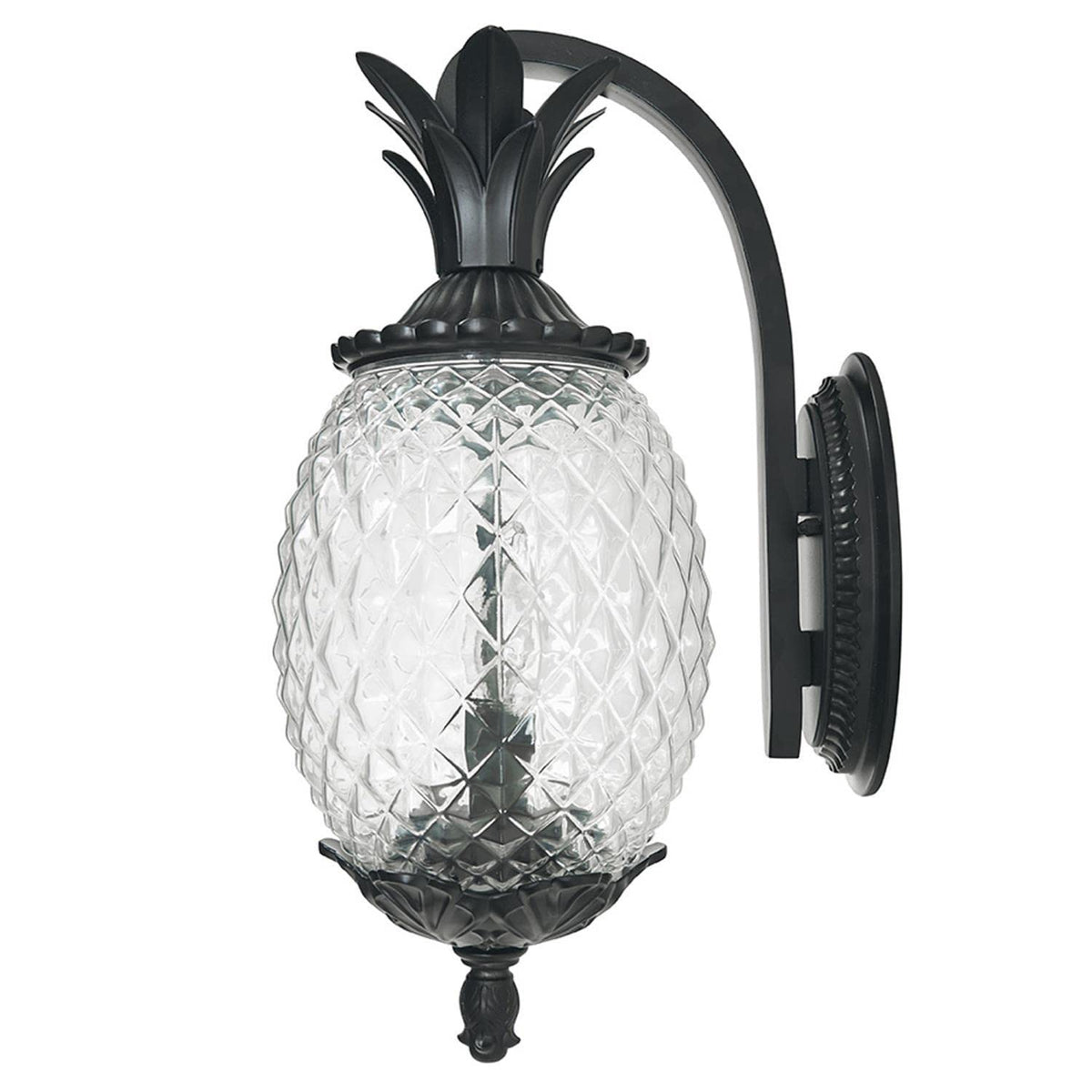 Collection embodies southern charm. Welcome guests with this fun tropical fruit shaped lantern. This popular collection is constructed of cast aluminum with clear, textured glass in the shape of a pineapple. Leaf, Flower, Fruit Two Light Outdoor Wall Mount from Lanai collection in Matte Black finish