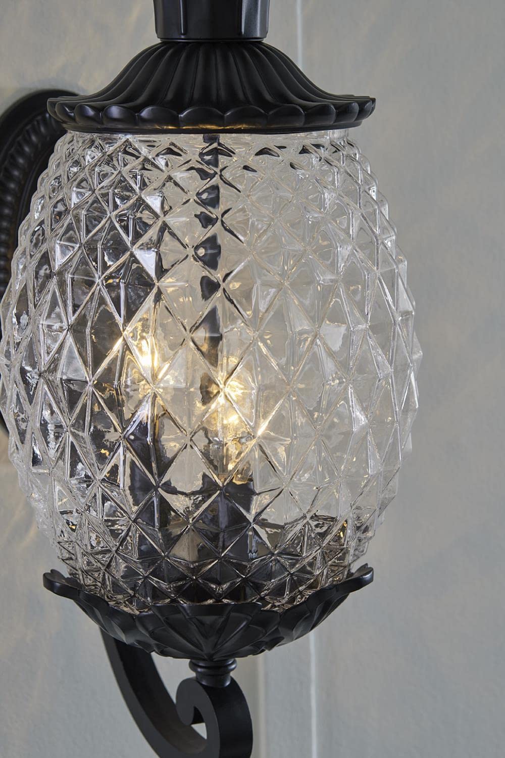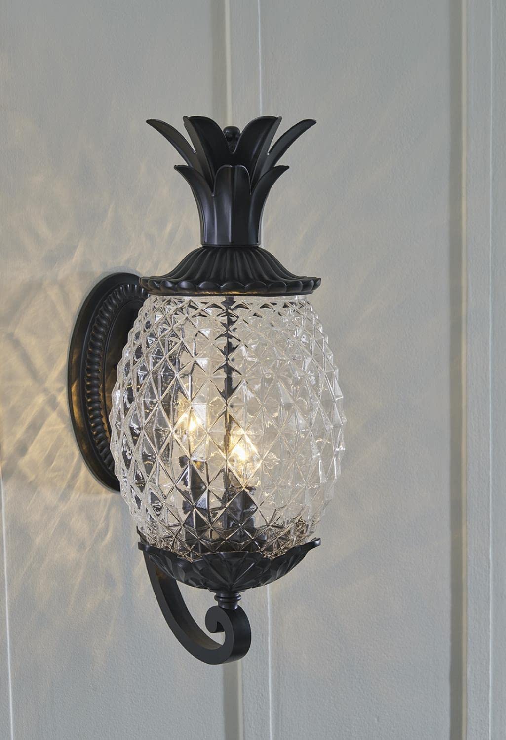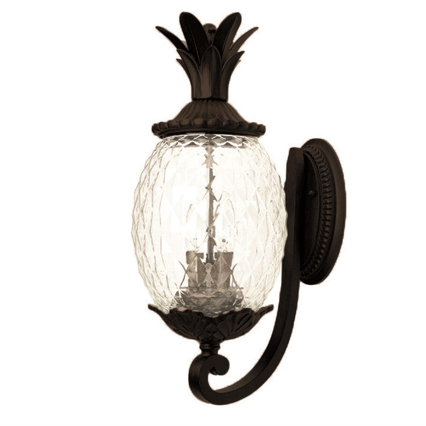 Collection embodies southern charm. Welcome guests with this fun tropical fruit shaped lantern. This popular collection is constructed of cast aluminium with clear, textured glass in the shape of a pineapple. Traditional Three Light Outdoor Wall Mount from Lanai collection in Matte Black finish