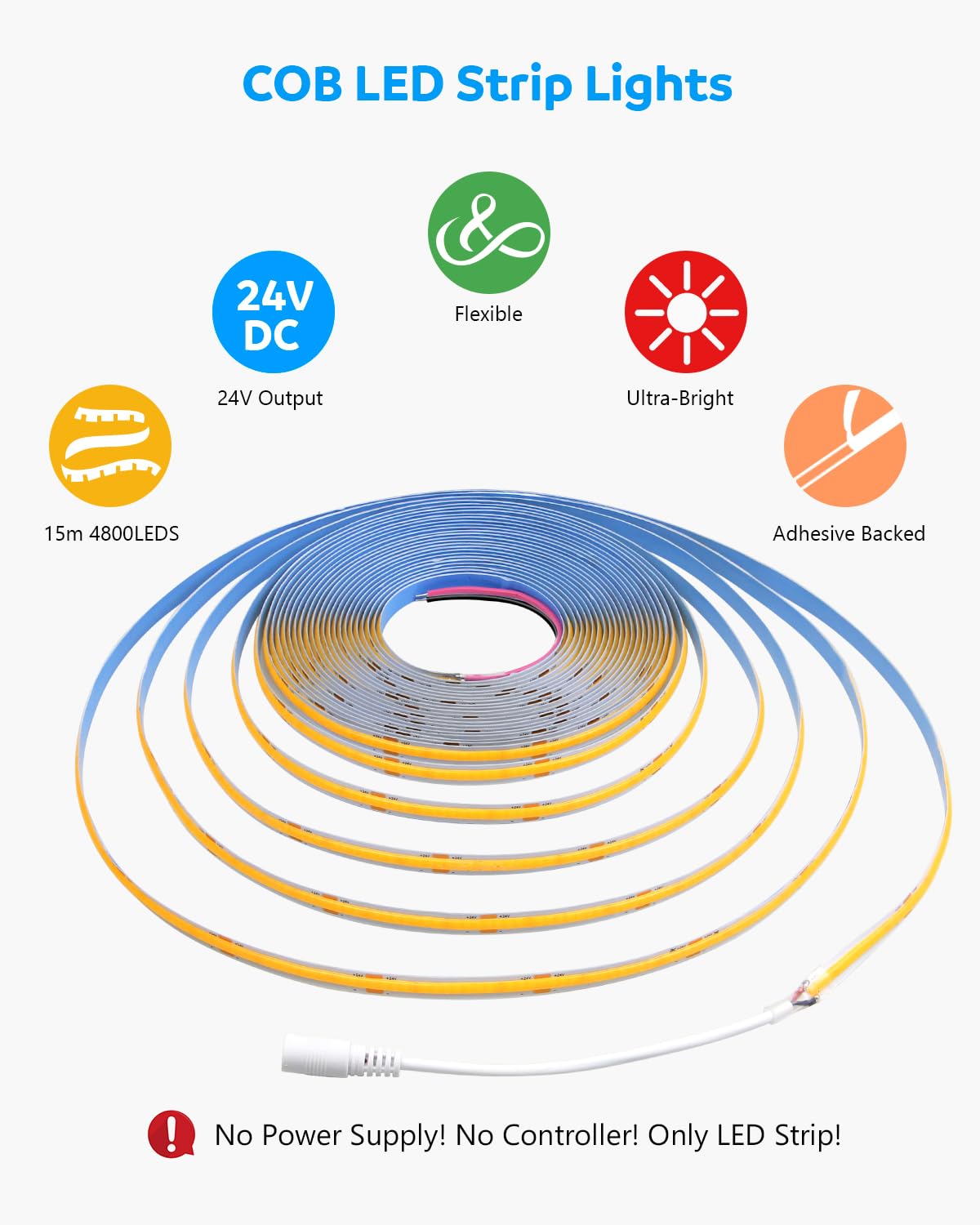 Kindly Note 1) It Comes Without Power Supply Or Dimmable Controller. 2) The Work Voltage Of The Led String Is 24V Dc. 3) Installation Surface Must Be Smooth, Clean And Dry. 4) Strip Should Not Be Collided Or Crushed. Parameter Item: Cob Led Strip Lights 50Ft Light Source: Cob Chip Emitting Color: Warm White Output Voltage: Dc 24V Led Quantity: 320Led/M Color Temperature: 3000K Protection Rate: Non-Waterproof Ip20 Item Weight: 0.2Kg Working Voltage: Dc 24V Working Power: 70W/15M Life Span: >50000 Hours Storage Temperature: -40? To 80? Operating Temperature: -25? To 60? Package Included 1X 50Ft Cob Led Strip Light