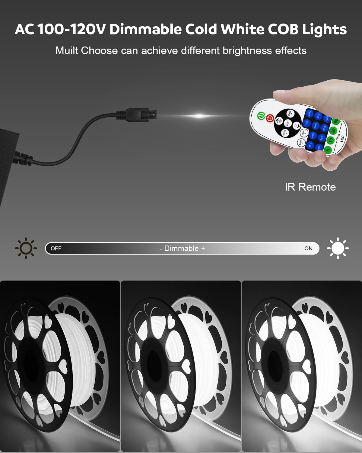 Parameter Item: Cob Led Strip Lights 30M Light Source: Cob Chip Emitting Color: Cold White Input Voltage: Ac 100V-120V Led Quantity: 288Led/M, 8640Leds/Roll Color Temperature: 6000K Protection Rate: Waterproof Ip65 Working Power: 8W/M Life Span: >50000 Hours Storage Temperature: -40? To 80? Operating Temperature: -25? To 60? Package Included 1X 100Ft Cob Led Strip Light 1X Remote Controller 100X Clips 100X Screws