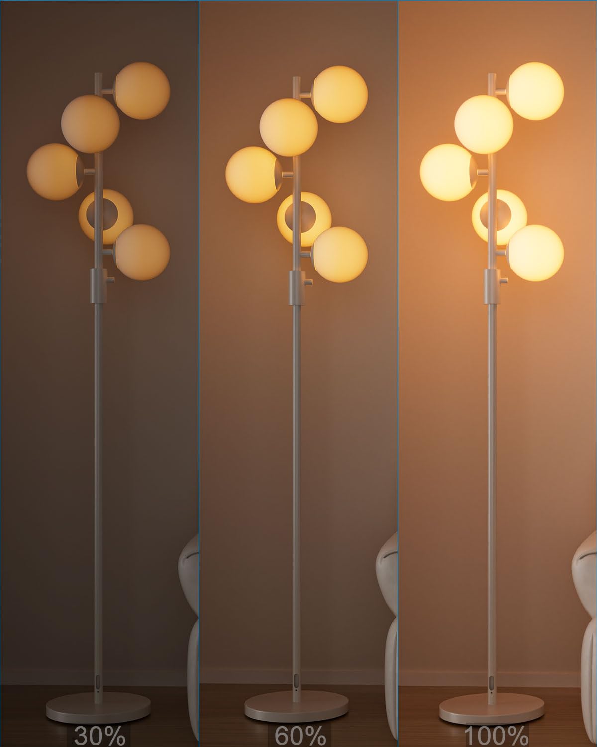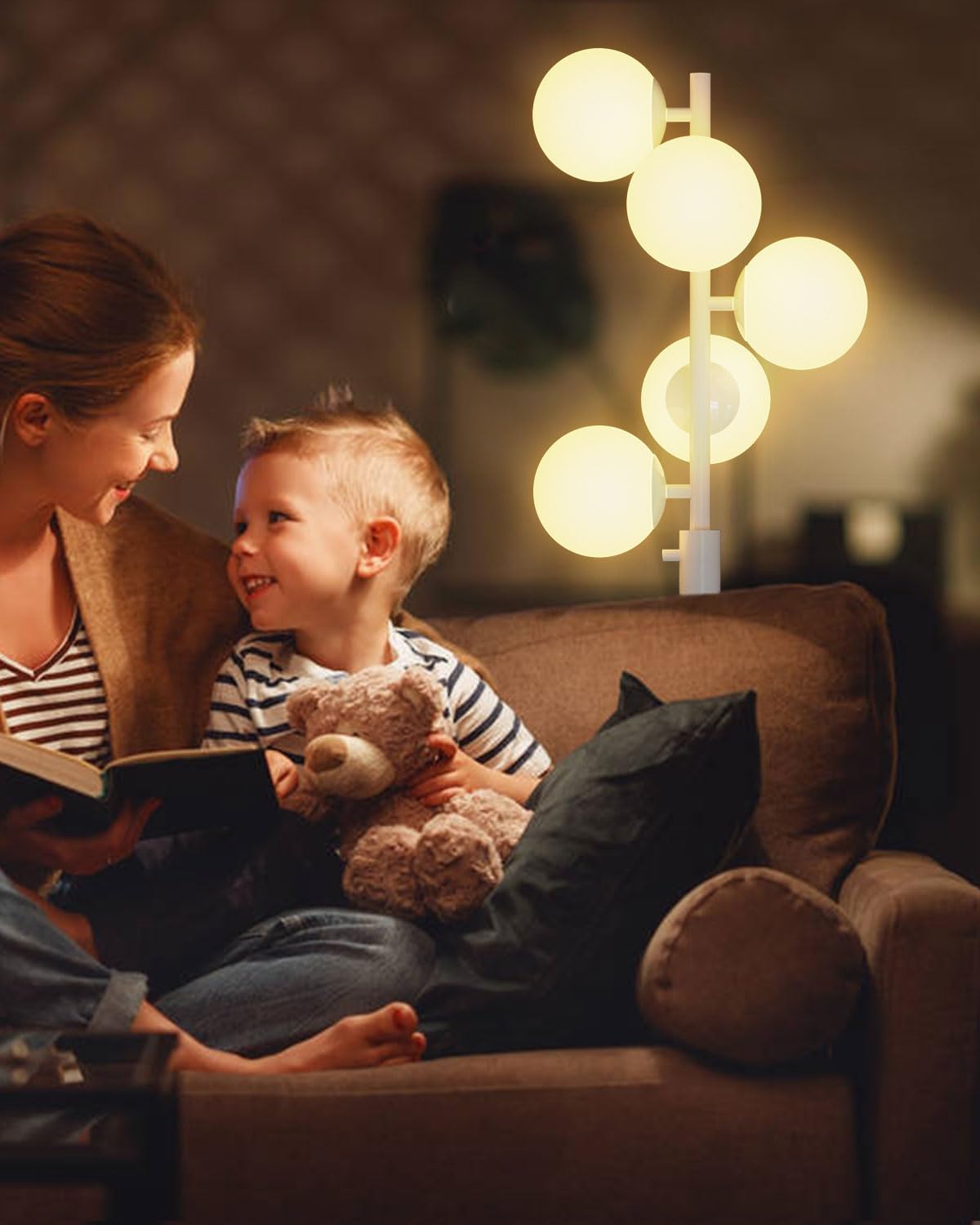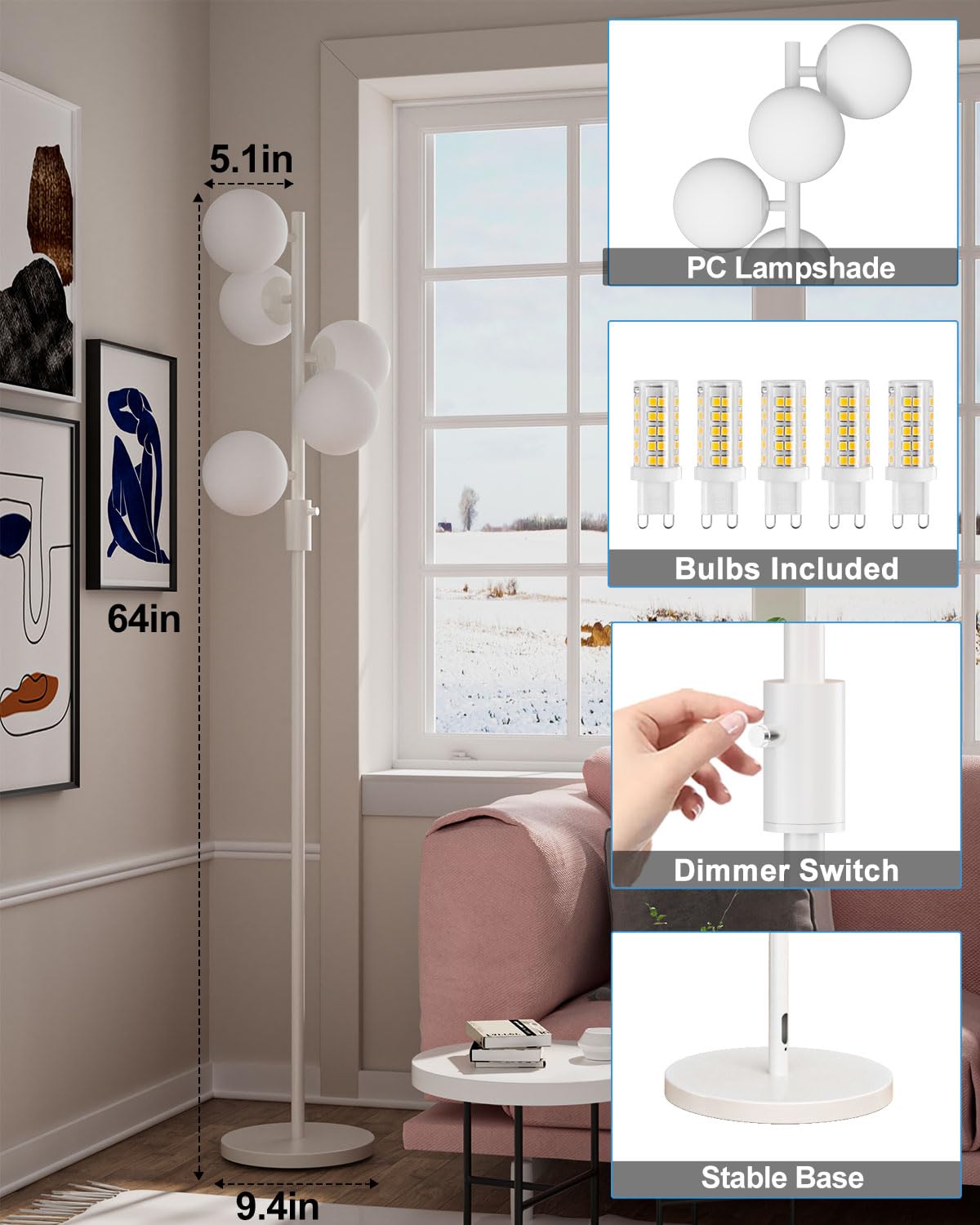 Acohook 64In Dimmable White Floor Lamp, Tall Standing Lamps With 5 Globe Soft Warm White Eye Care 3000K G9 Bulbs, Mid Century Mo