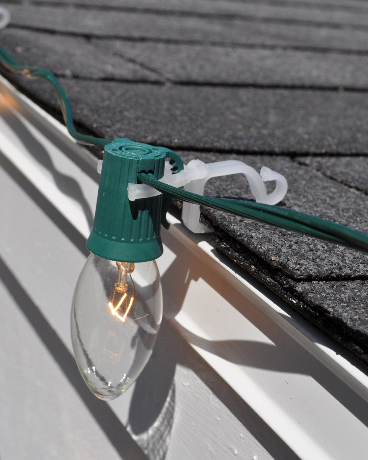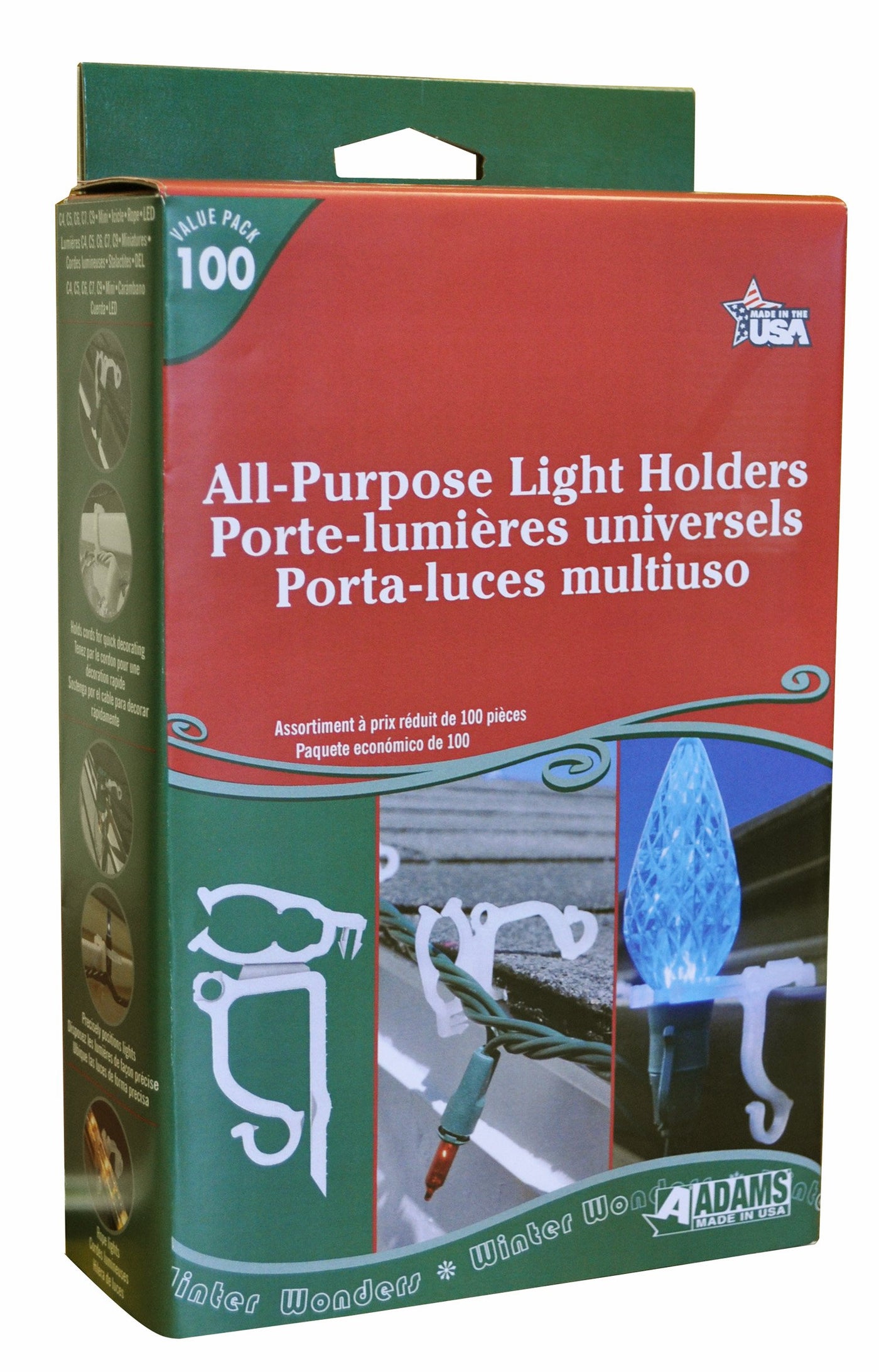 Adams All-Purpose Light Clips - Holds any size light for precise, vertical positioning - including mini lights, C7, C9, and rope lights. Ideal for icicle and swag lights too. The all-purpose light holder works on all roofs, including shakes, slate and tile; on all gutters, K or U styles, aluminum, copper, or vinyl. It also works safely on vinyl siding and can be used to string lights on deck railings and fences. Box of 100. - Color: White, Type: Clip-On, Material: Plastic, Pkg Qty: 100, Package Type: Box