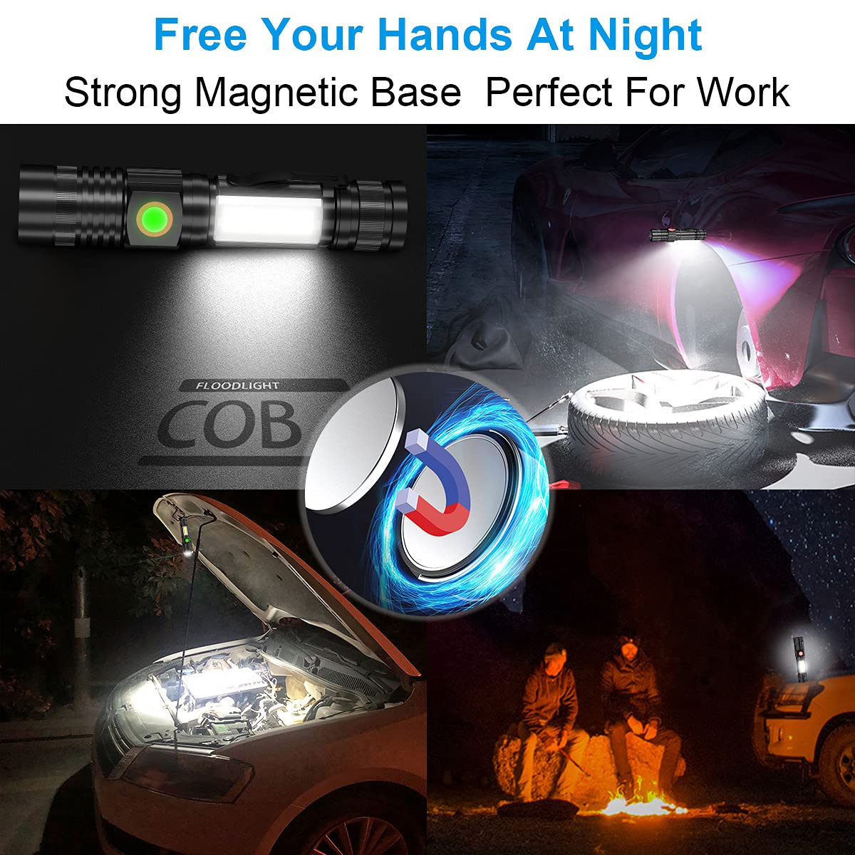 Why Choose Our Rechargeable Magnetic Flashlight? 1.Super Bright Led Flahlight --- High Lumens Flashlight Provide And Can Be Up To 600Feet Illumination Distance 2.Rechargeable Flashlight With Usb Cable And Rechargeable Battery. 3.Magnetic Flashlight With Cob Sidelight ---Strong Magnet At The Bottom Of The Flashlight And Can Adsorbed On Materials Such As Iron And Stainless Steel. When You'Re Camping Hiking Repairing, It Let You Hands Free. 4.Muti-Mode For Using--- There Is 4 Lighting Mode :High Brightness, Medium Brightness, Low Brightness, Strobe, Sos, Cob Sidelight, Which Are Meet Your Requirements 5.Water Resistant &Adjustable Zoom---Adamstar Led Flashlight Is Ipx5 Waterproof ,It Is Totally Ok When You Use In Rain Day. And Adjustable Zoom That Allow You Can Ajust Focus By Stretching Body Of Flashlight, According To The Situations. 6.Convenience---Light Weight And Compact Size For Portability. A Pocket-Friendly Compact Chassis With A Pocket Clip Makes This Rechargeable Pocket Flashlight Convenient To Carry In Everyday Life. 7.One-Key Turn Off The Flashlight :Only Press 1 Seconds To Turn Off The Flashlight At Any Mode, No Need To Cycle Through All Mode. 8.You Will Connect With A Knowledgeable, Humorous, Hard-Working Customer Service Staff, And 100% Solve Any Problems Of All Customers. We Will Reply You Within 24 Hours. We Promise: Product Is Defective ? Free Replacement!