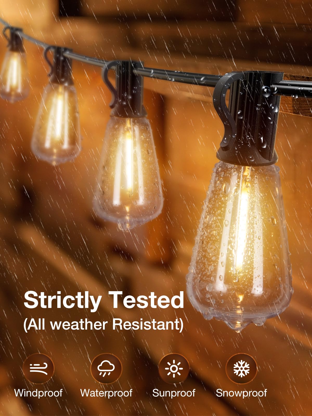 ?Weatherproof And Shatterproof?Ip65 Waterproof Led String Lights Can Withstand Cloudy, Damp, Windy, Foggy, Rainy, Snowy, Or Extreme Temperatures,This Making It Ideal For Year-Round Use In Outdoor Spaces Like Patios, Gardens, And Bistros, Creating A Festive And Inviting Atmosphere.Besides, These Led Bulbs Made From Unbreakable Pet Material And Hard Anti-Drop Plastic Shells,This Ensures The Safety Of Your Family, As There Is No Risk Of Broken Glass Shards While Hanging These Backyard Lights