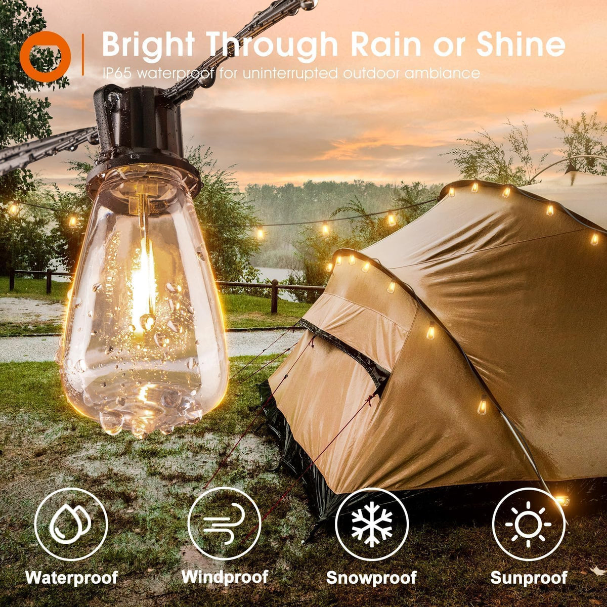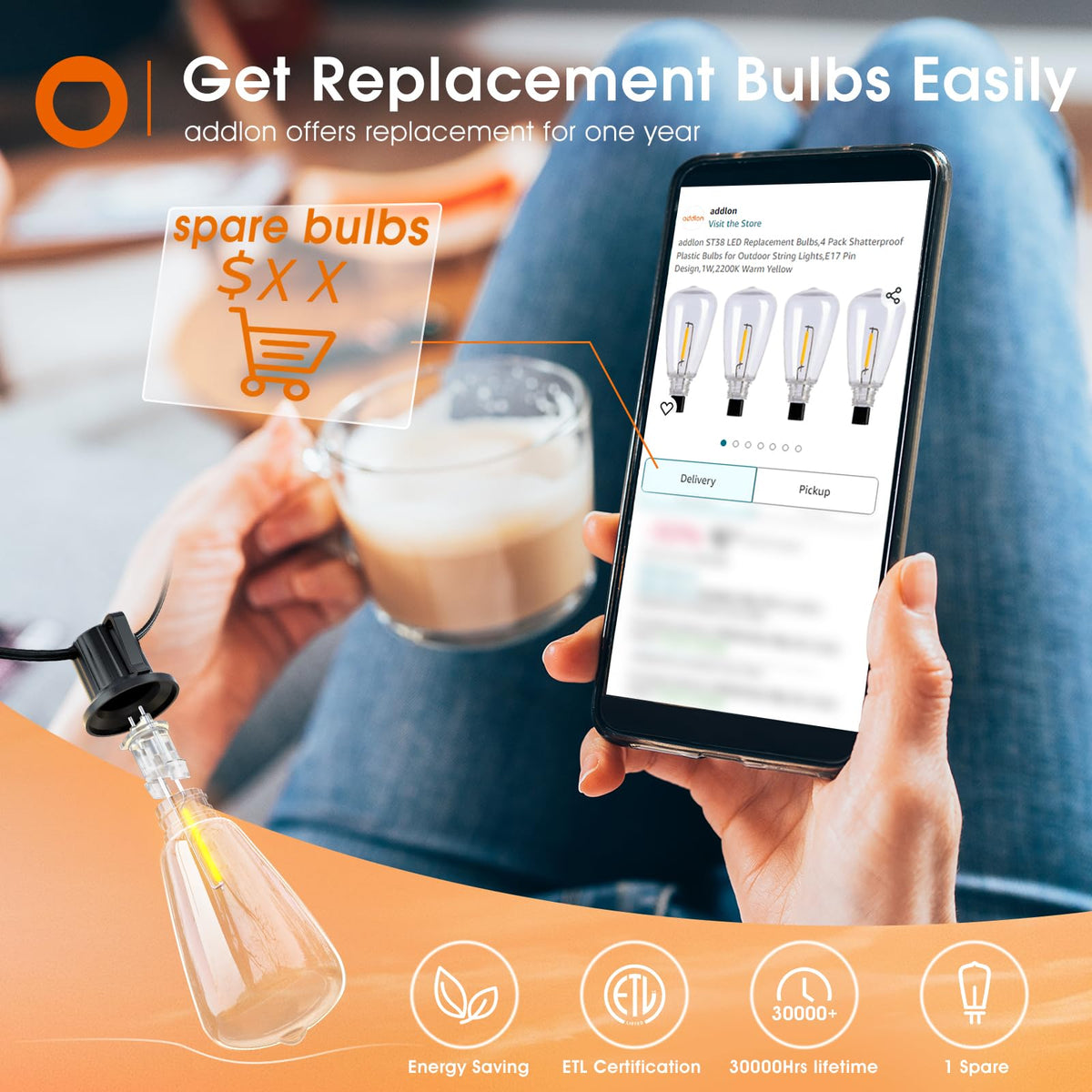 Q: What type of bulbs do these string lights use?A: The addlon outdoor string lights come with 9 shatterproof LED ST38 bulbs, including 1 spare bulb, which are energy-efficient and can last up to 30,000 hours.