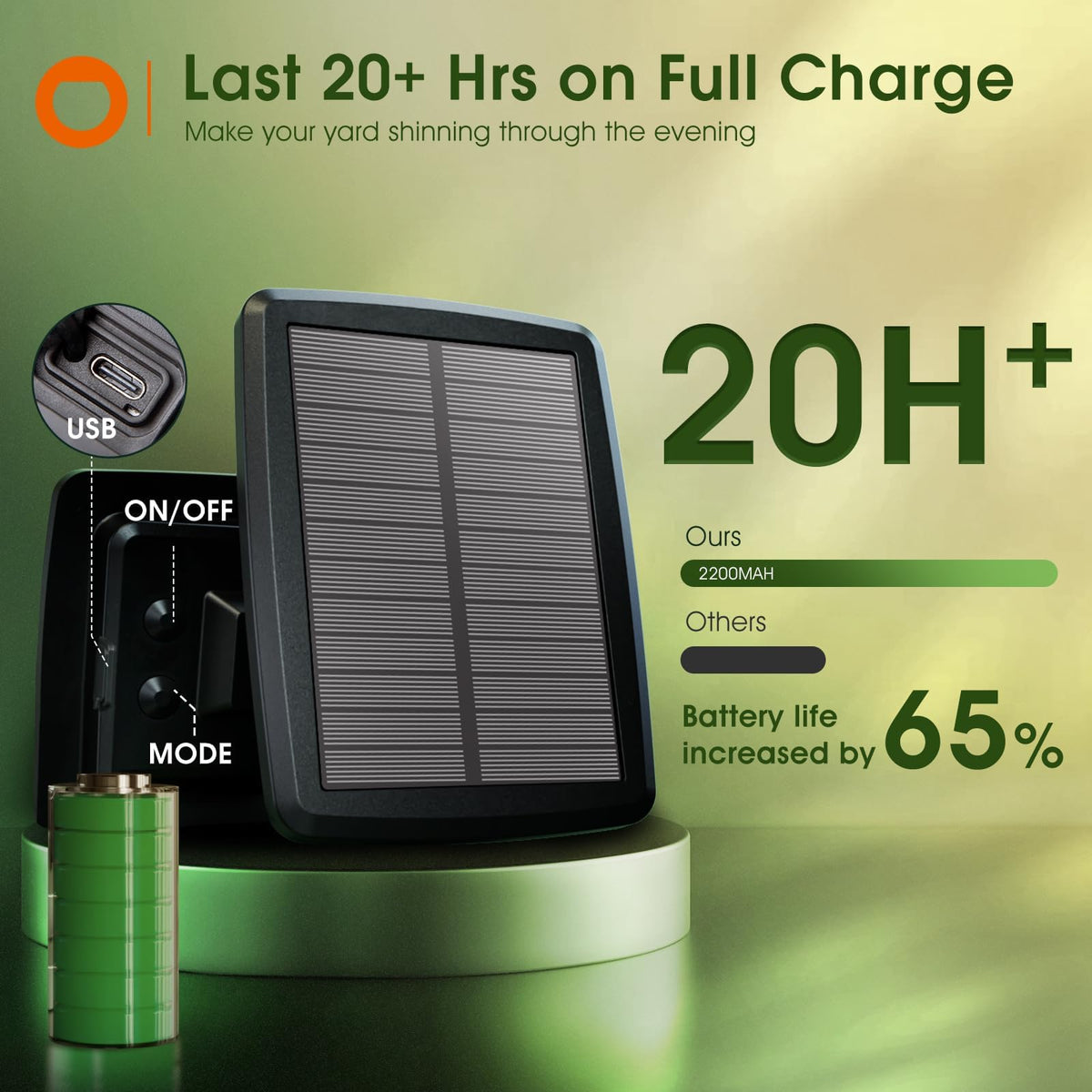 Q: How long do the addlon 25FT Solar Powered Outdoor String Lights last on a full charge?A: The addlon 25FT Solar Powered Outdoor String Lights can provide 15-20 hours of usage on a full charge, thanks to its 2200mAh high-capacity energy panel.