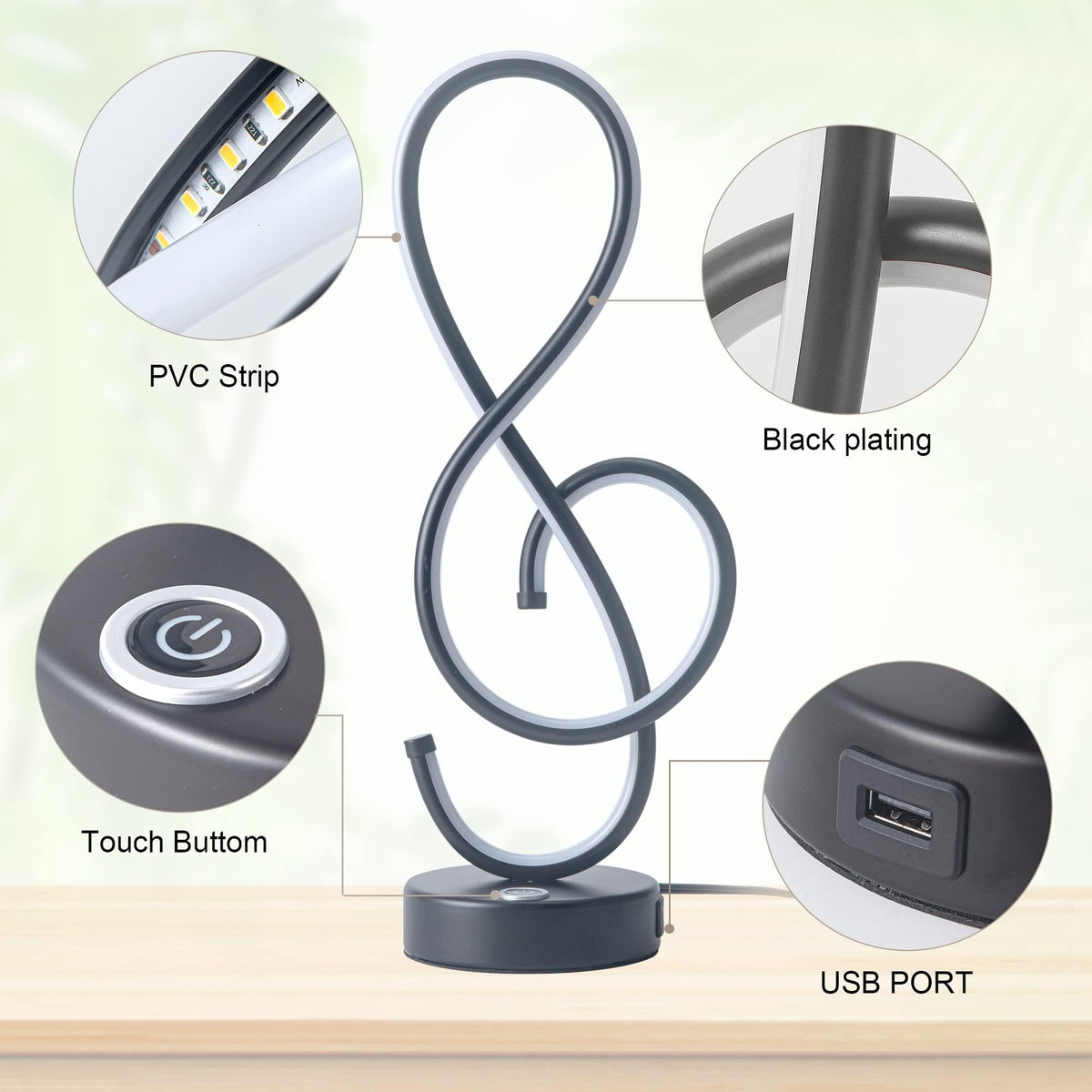 Modern Table Lamp, Led Bedside Lamp With Usb Port, Touch Stepless Dimmable Nightstand Light, Unique Musical Note Design, Spiral Black Lamp For Bedroom, Living Room, Home Office