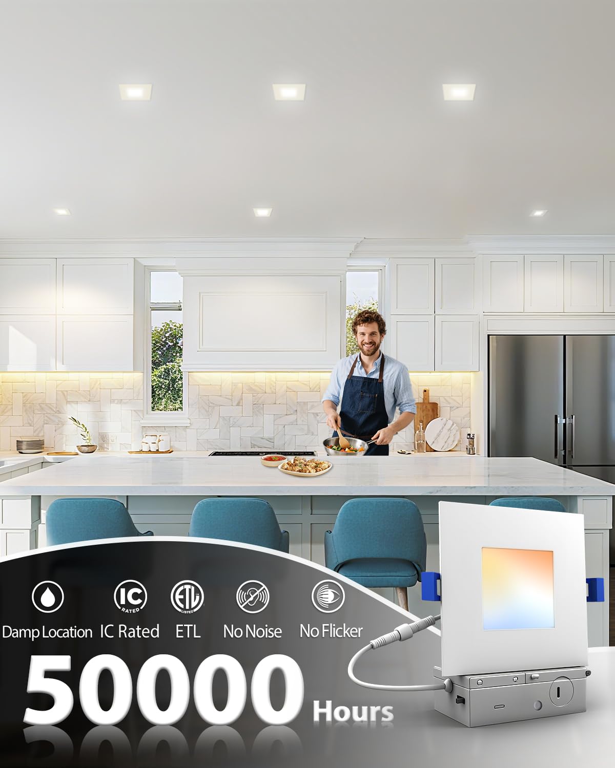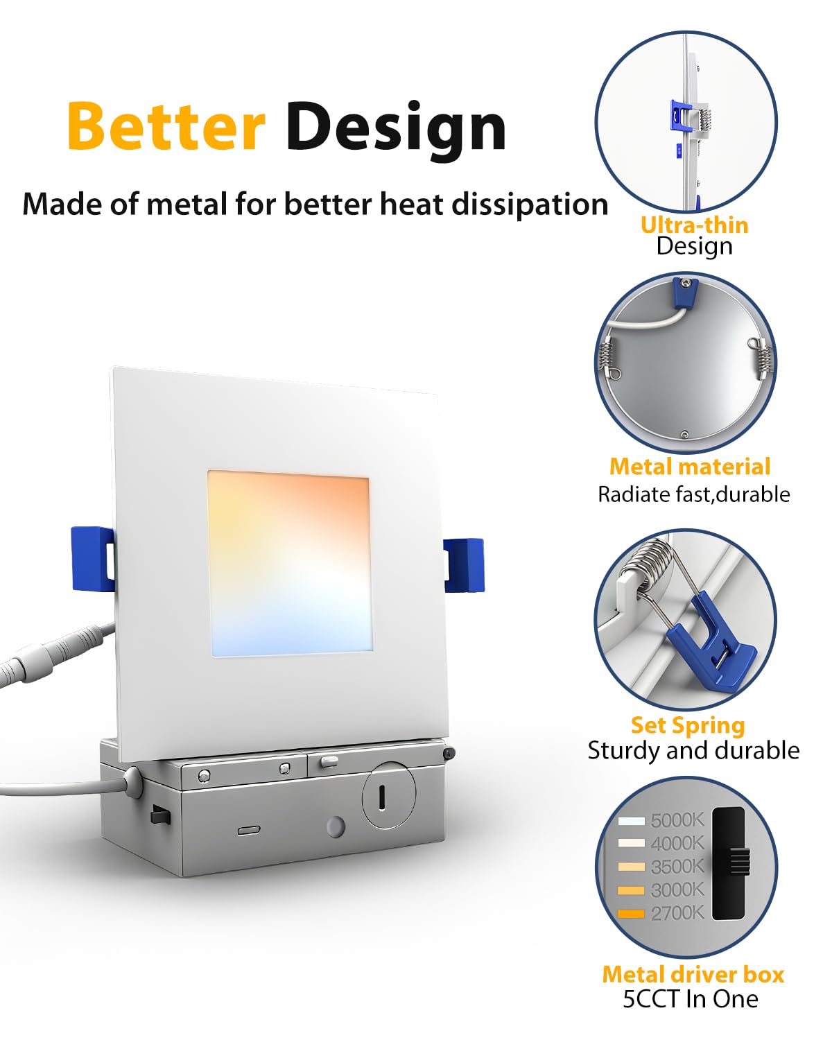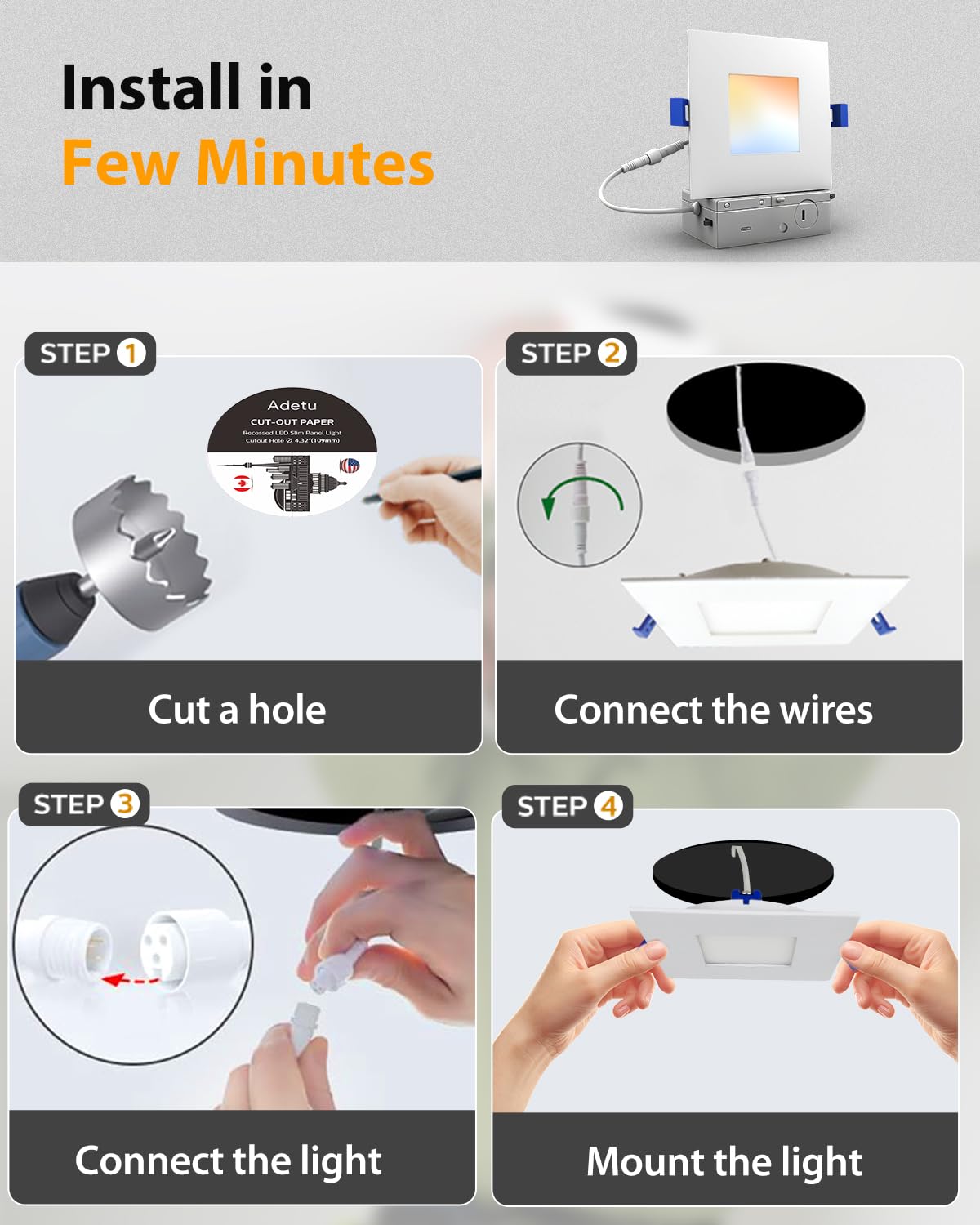 Adetu 12 Pack 4 Inch Square Led Recessed Lighting 5Cct Ultra Thin Square Led Ceiling Light With Junction Box 10W 860Lm Cri90 2700K-5000K Selectable Dimmable Canless Downlight Etl And Energy Star