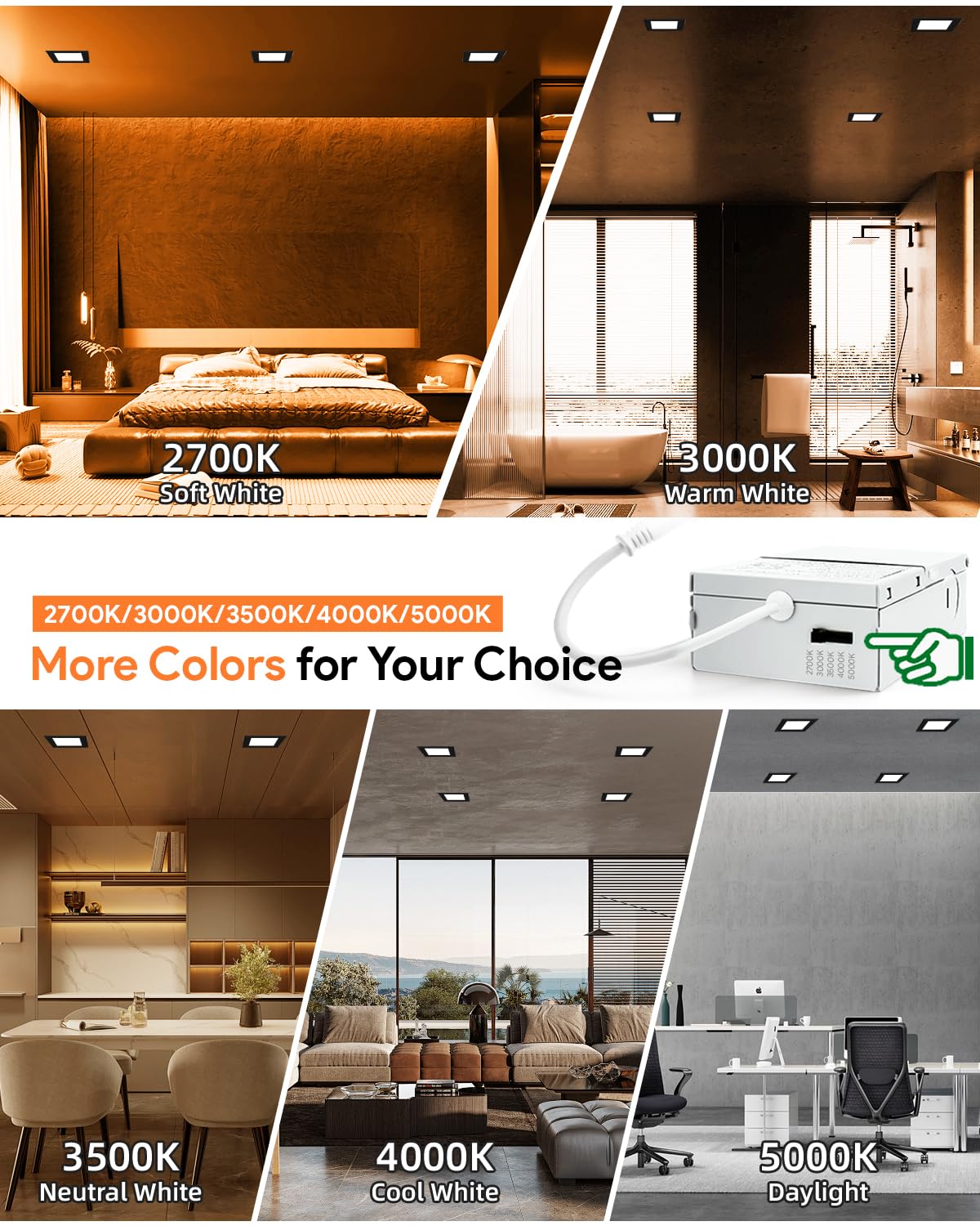Q: What are the different color temperature options for the Adetu 6 inch Square Led Recessed Lighting?A: The Adetu 6 inch Square Led Recessed Lighting offers five color temperature options: 2700K (soft white), 3000K (warm white), 3500K (neutral white), 4000K (cool white), and 5000K (daylight). You can easily switch between these settings using the slider switch on the junction box.