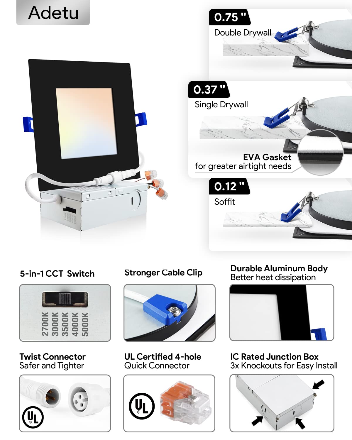 Q: How easy is it to install the Adetu 6 inch Square Led Recessed Lighting?A: Installation is straightforward and can be completed in minutes. Simply cut a hole in the ceiling using the provided 1:1 hole template, connect the junction box to the cable, and use the spring clips to secure it in place. It requires only 2 inches of ceiling space and fits various ceiling types.